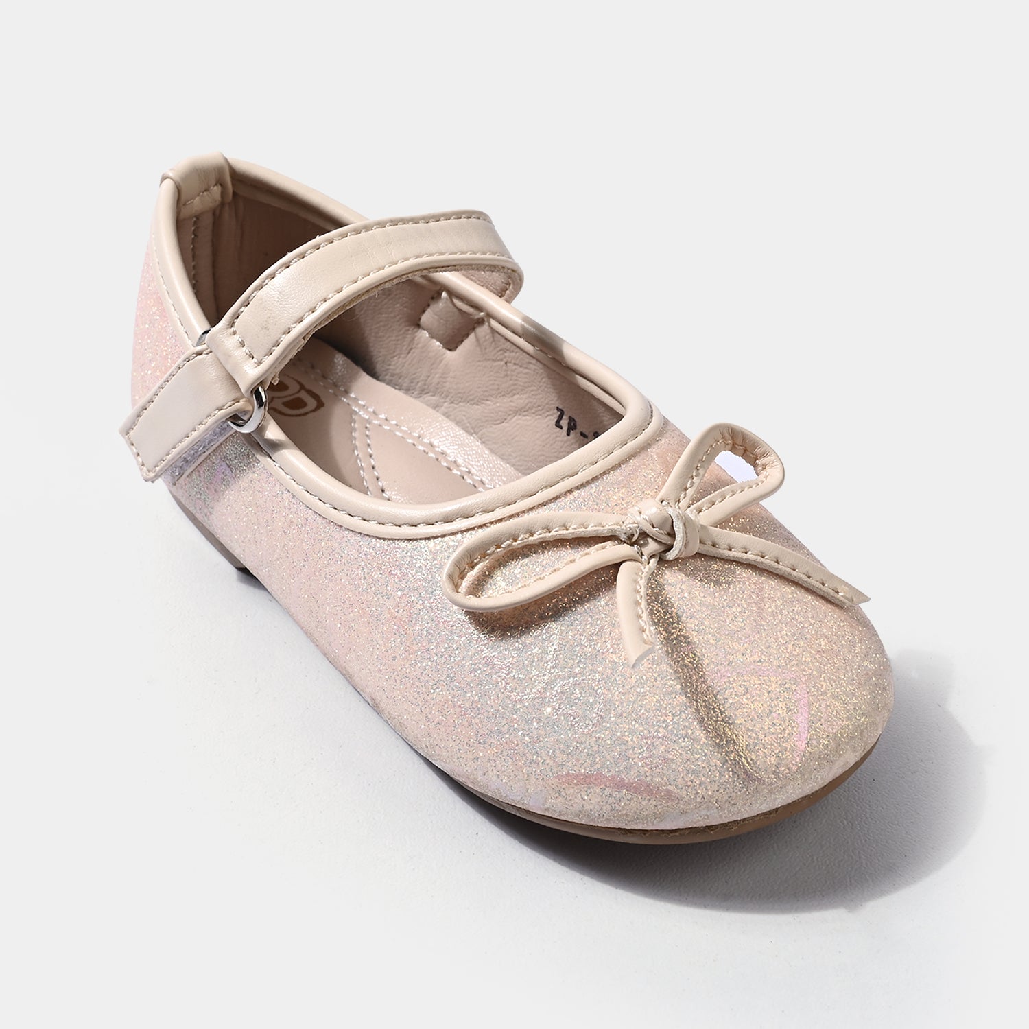 This beige flat pump features a glittery finish and a bow detail. An adjustable strap and cushioned lining ensure a secure, comfortable fit for everyday wear or special occasions.