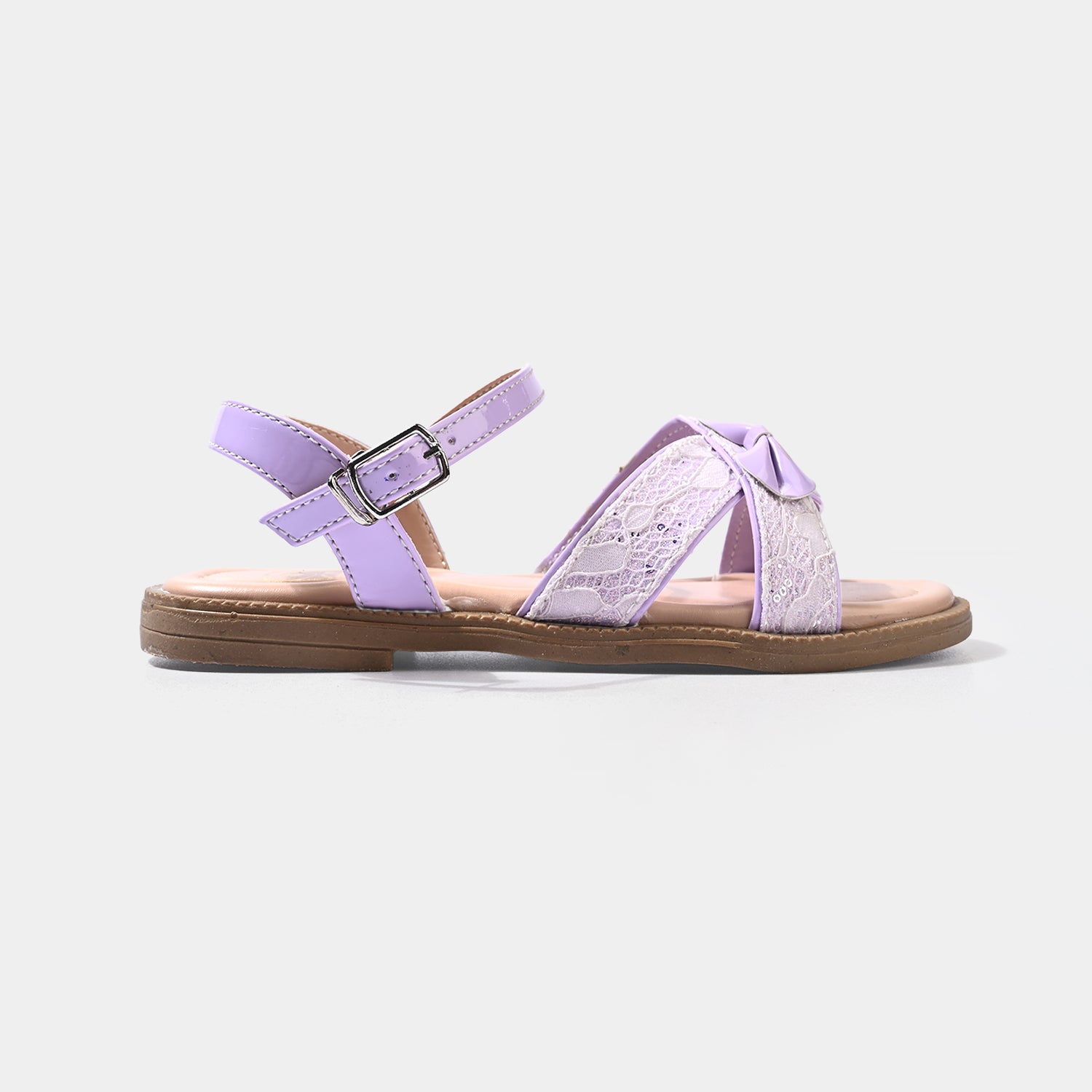 This light purple flat sandal features a delicate lace-textured front strap and bow detail at the center. The adjustable ankle strap with a secure buckle allows easy movement and comfort throughout the day.