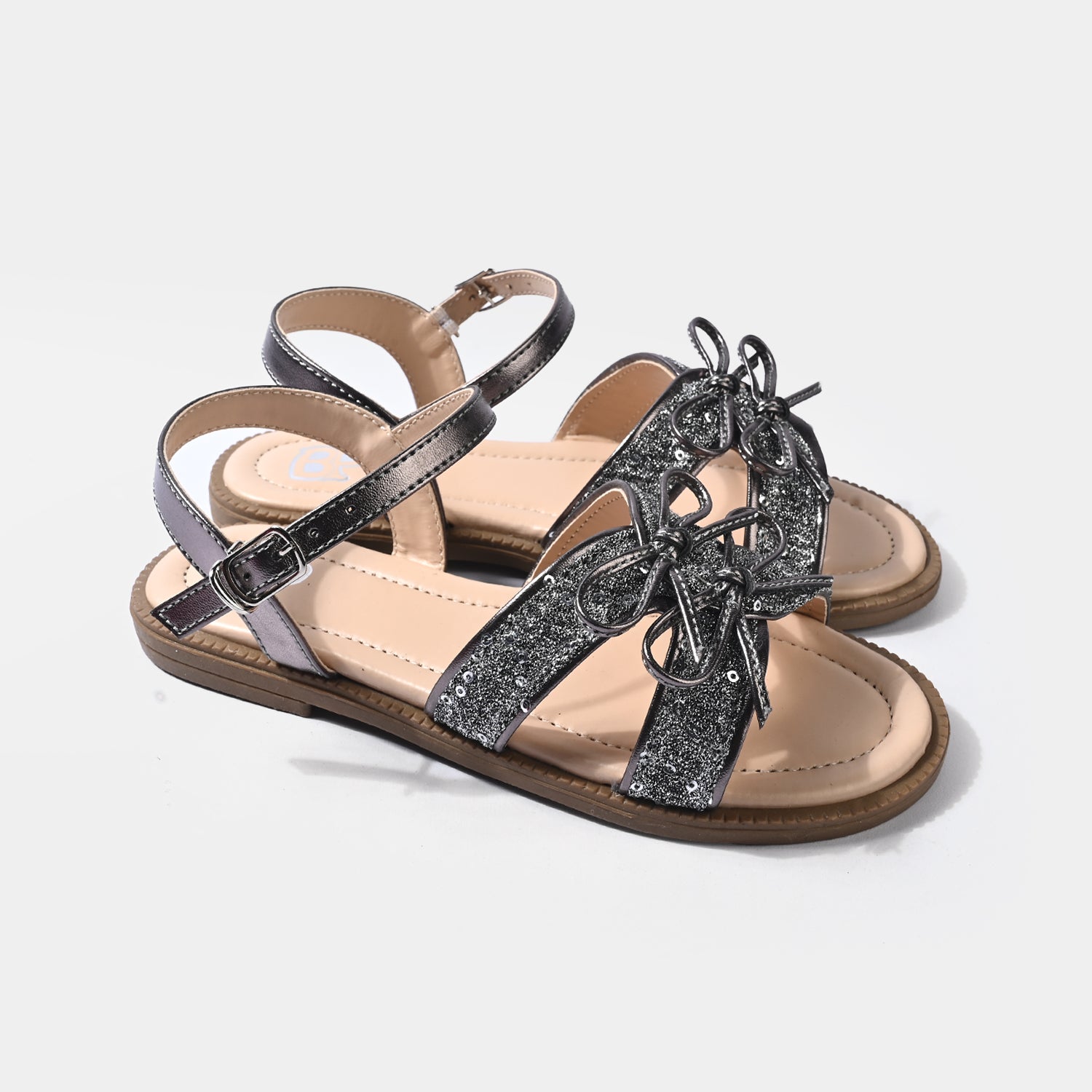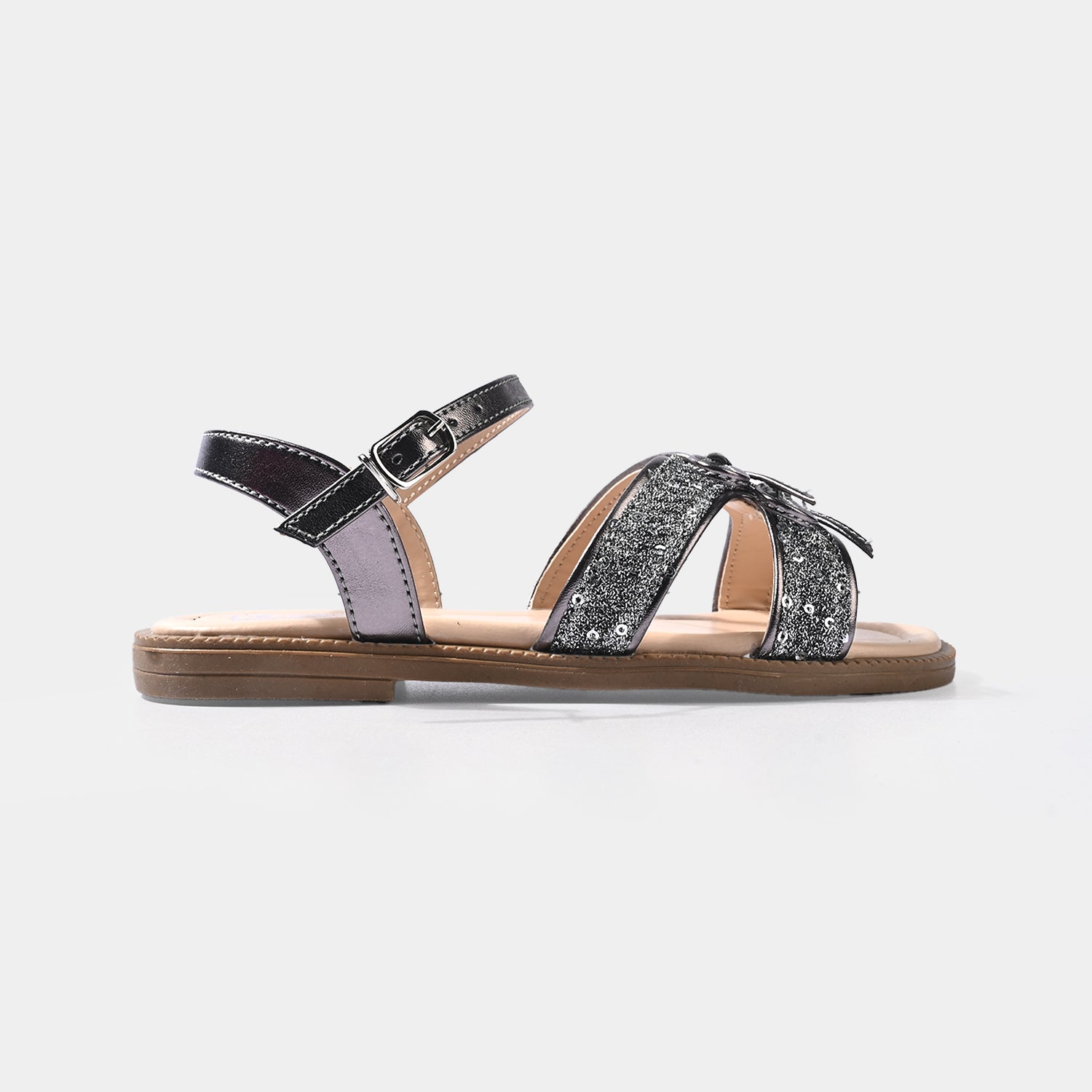 Girls’ sandal in grey featuring bow embellishments, a secure adjustable buckle strap, and a shiny glittery finish for a complete festive look.