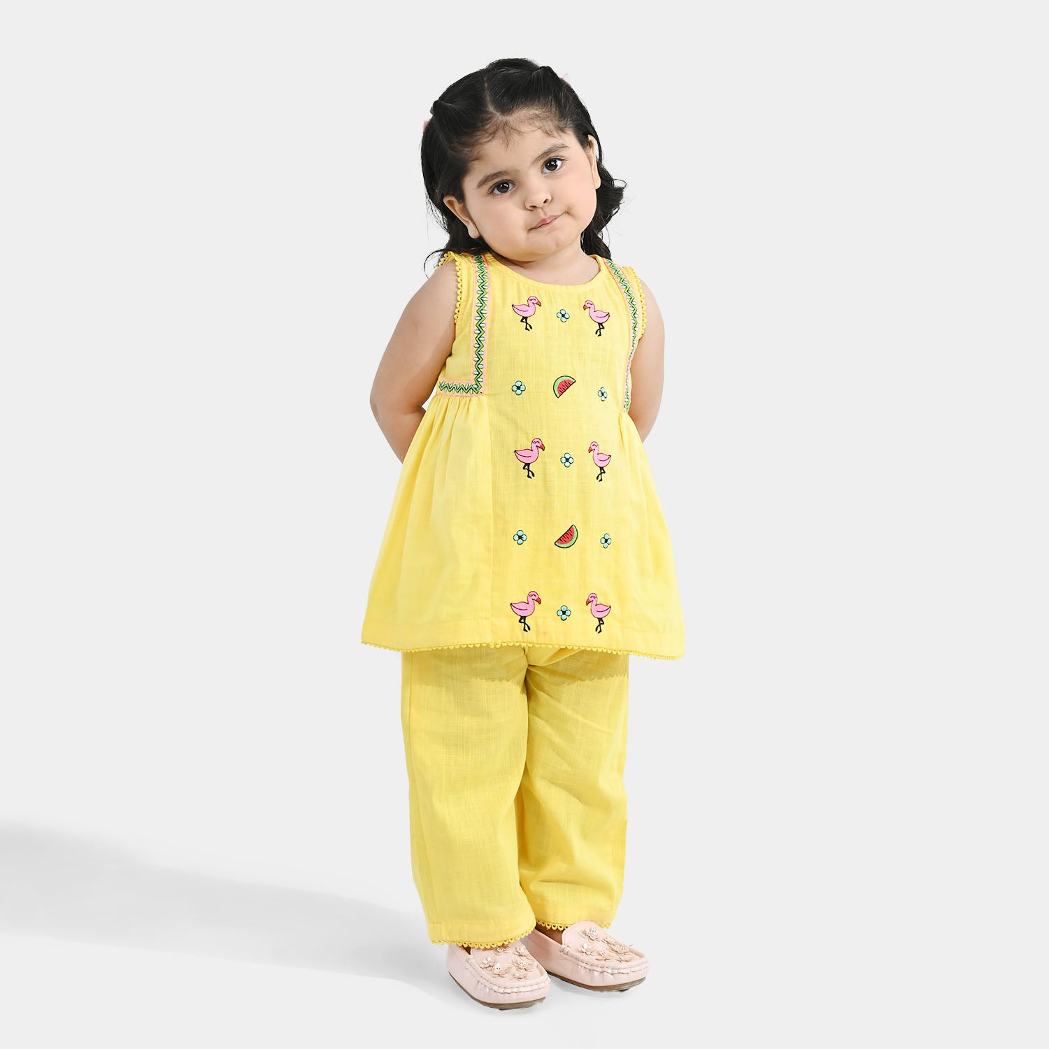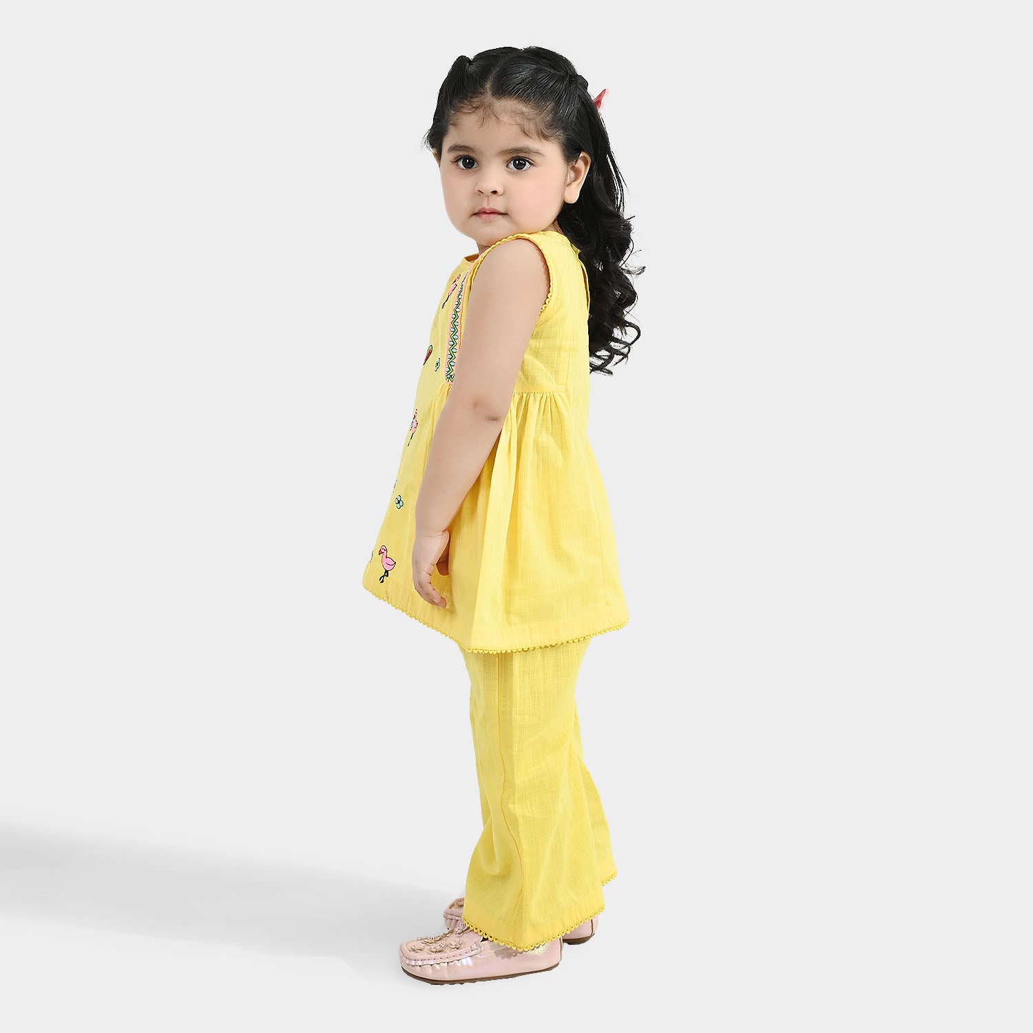 Infant girls lemon yellow cotton slub 2-piece set featuring a sleeveless round-neck frock with side pleats and lace detailing, paired with matching loose culottes, perfect for comfortable and stylish everyday wear.