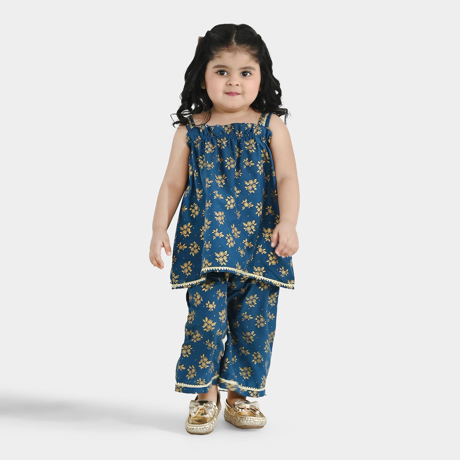 Infant girls' teal poly cambric 2-piece set featuring a strap-style shirt with lace detailing and matching culottes, perfect for comfortable and stylish everyday wear.