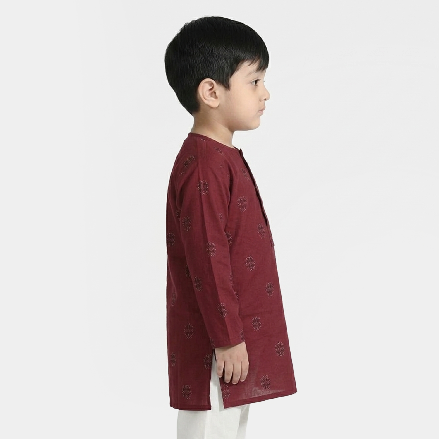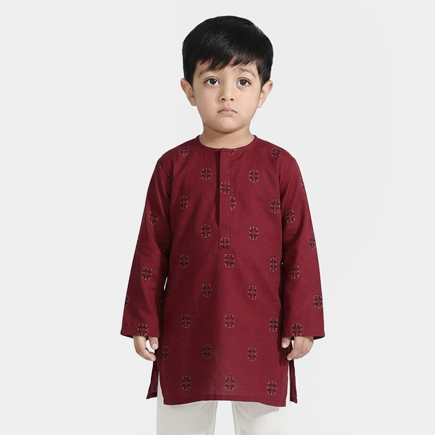 Infant boys' red cotton jacquard printed kurta featuring a classic round neckline, full sleeves, and front button opening, perfect for a stylish and comfortable festive or everyday look.