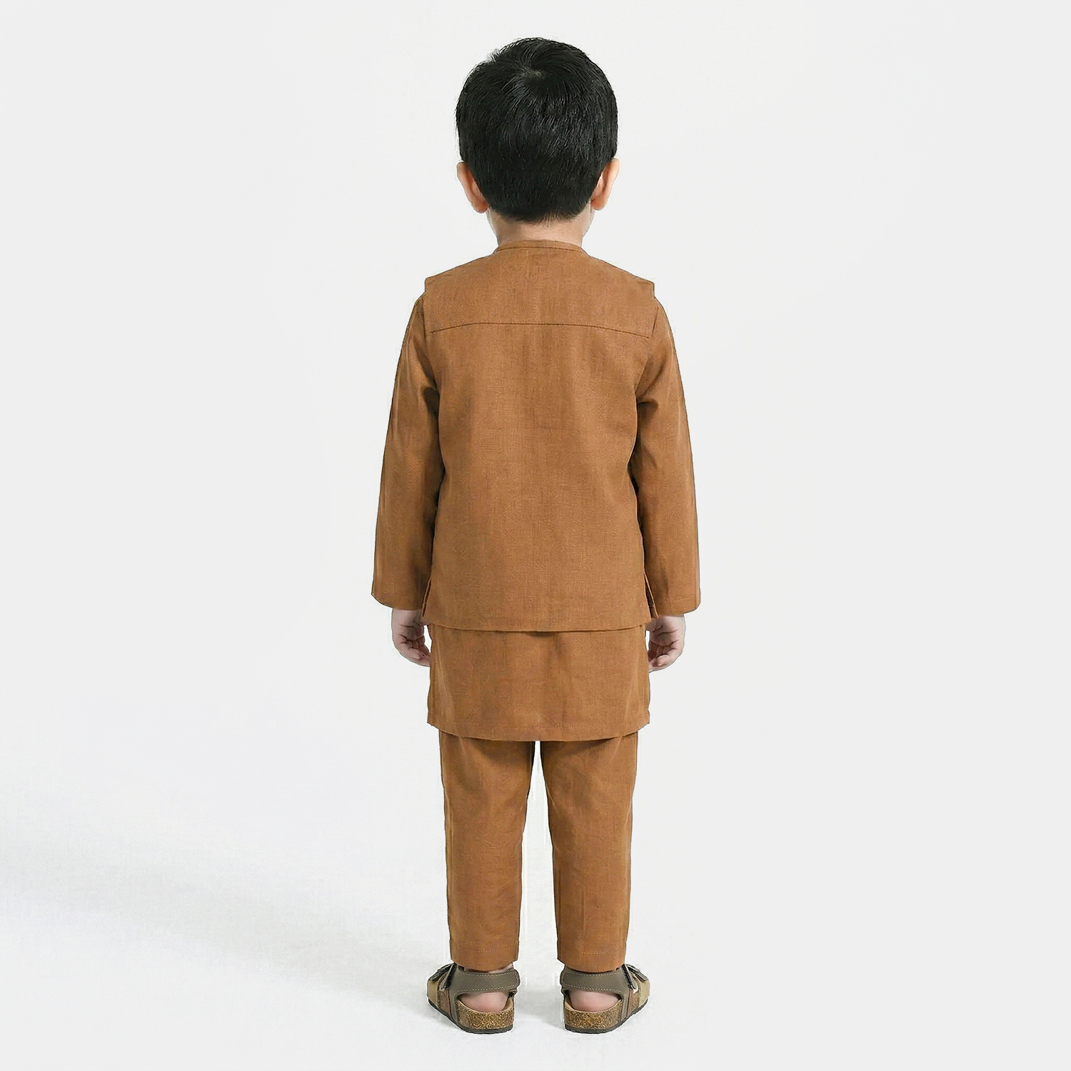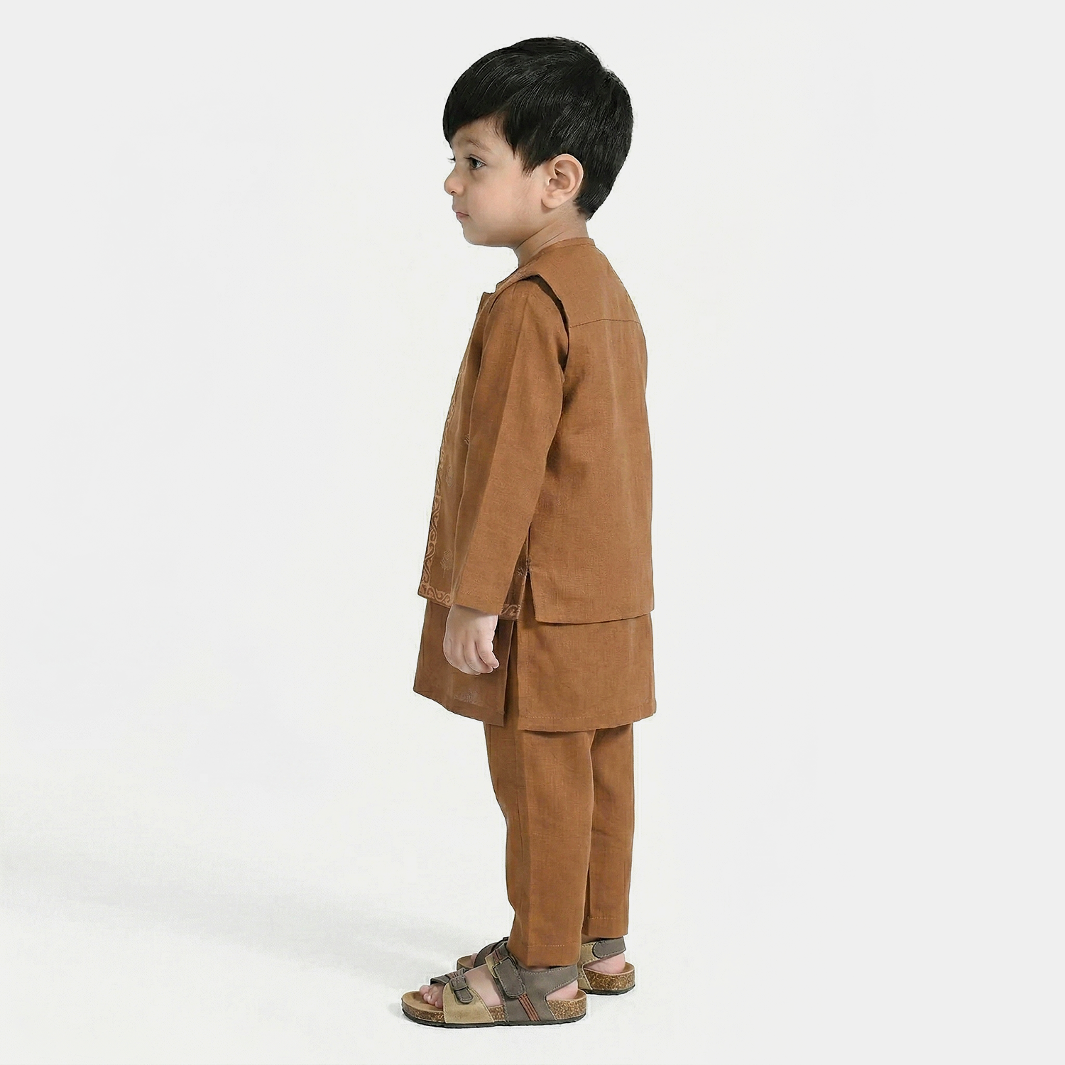 Infant boys' brown cotton slub 3-piece suit featuring a round kurta with patti neckline and button opening, full sleeves, matching bottoms, and an embroidered waistcoat, perfect for festive wear.