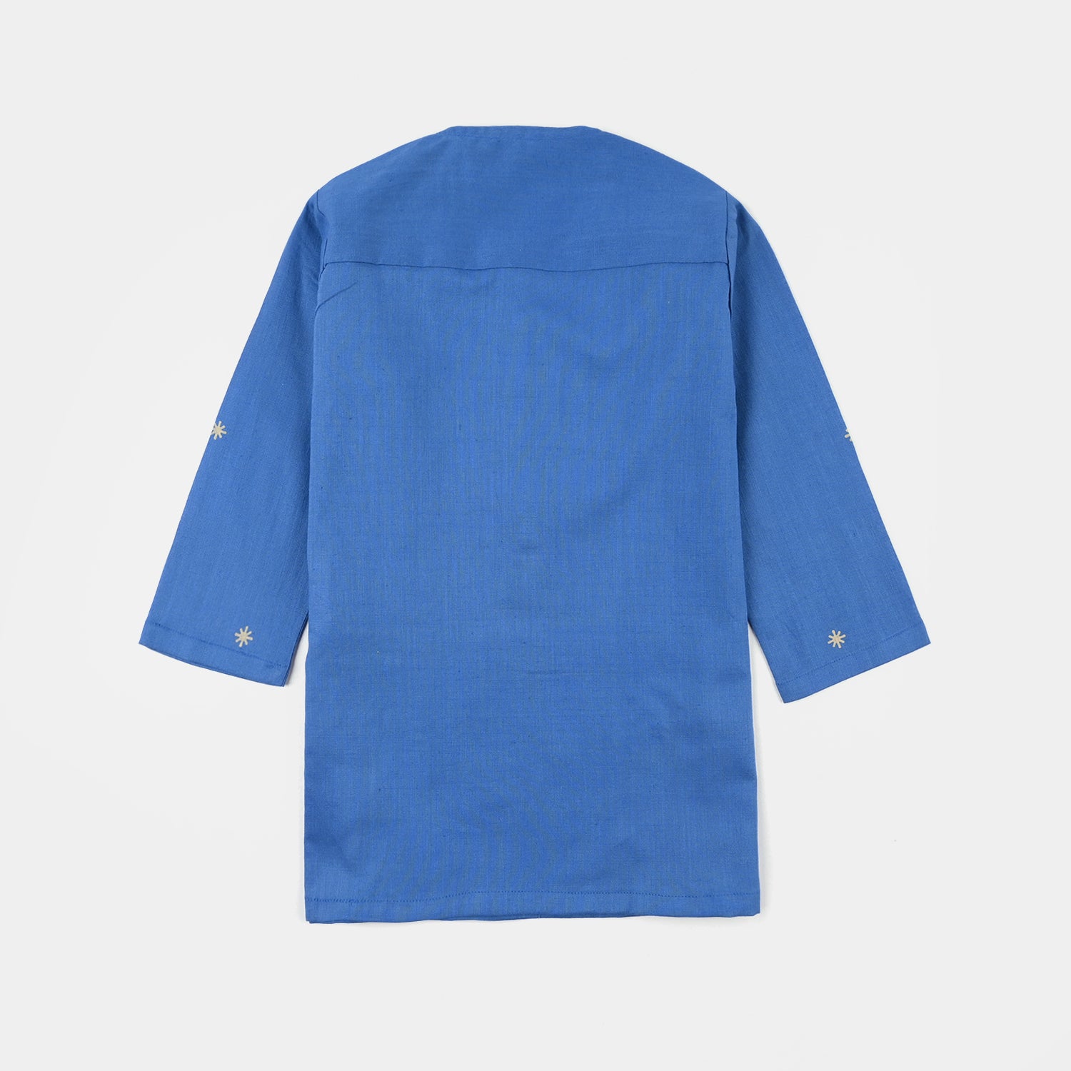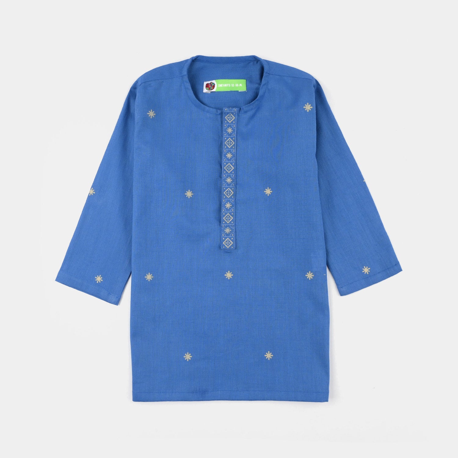 This blue cotton slub printed kurta for infant boys features a round kutta patti neckline and full sleeves, perfect for a comfortable and stylish everyday look.