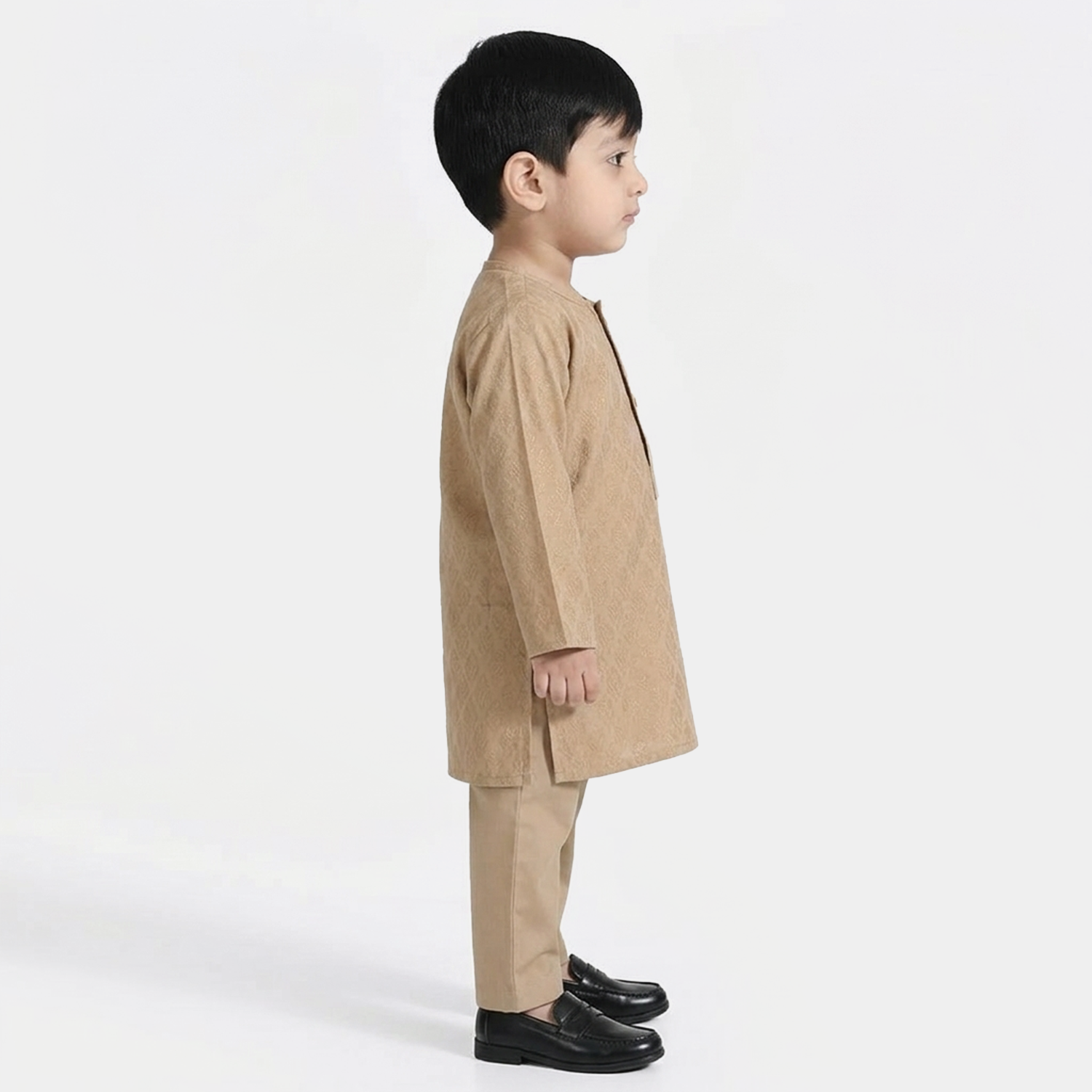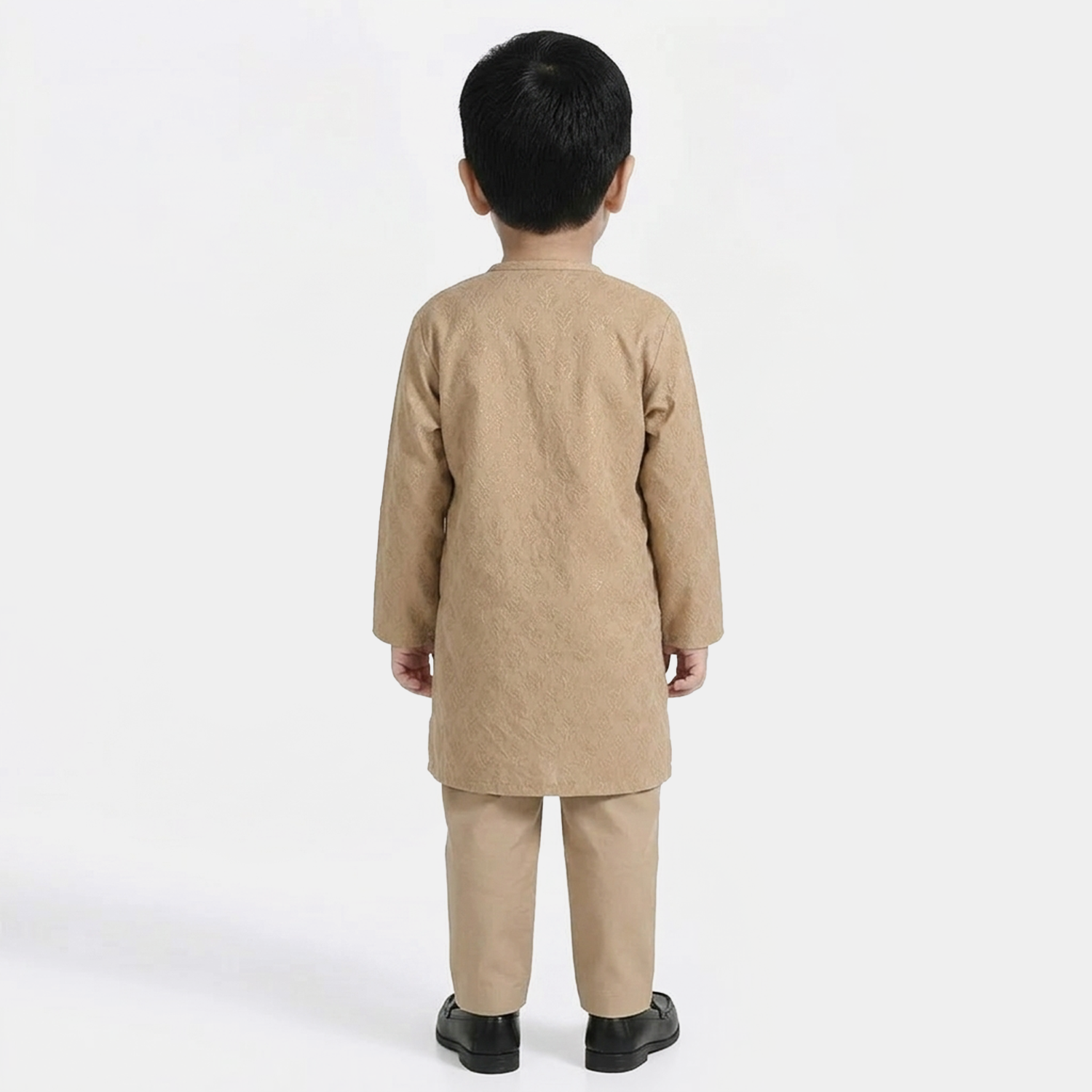 Infant boys' beige jacquard kurta pajama featuring a full-sleeve kurta and matching pajama, perfect for a stylish and comfortable festive or everyday look.