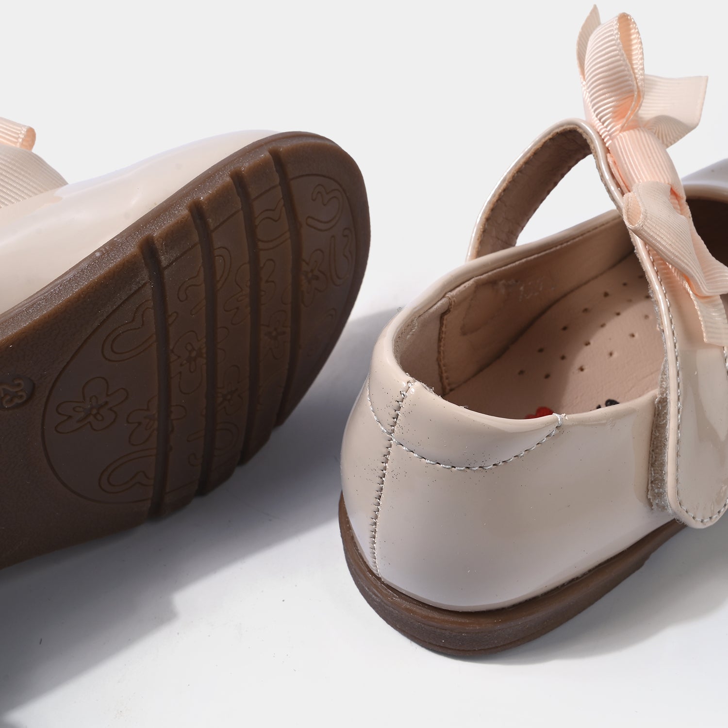 Girls' shoes in beige feature a plain design and an adjustable strap with a bow embellishment, perfect for everyday wear or casual outings.