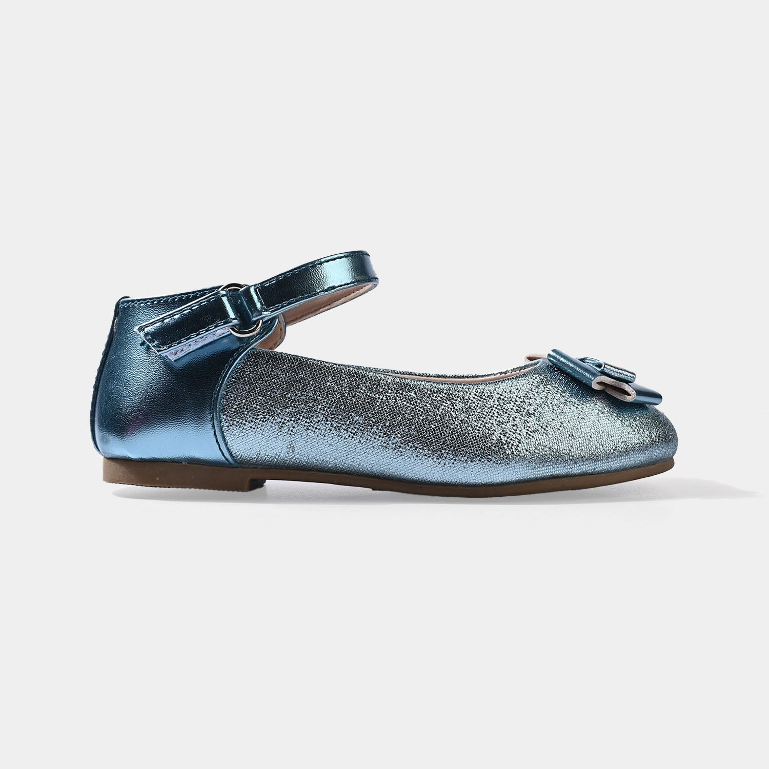 Girls' pumps in blue feature a shiny/glittery finish with a delicate bow and a secure buckle strap for a stylish and comfortable fit.