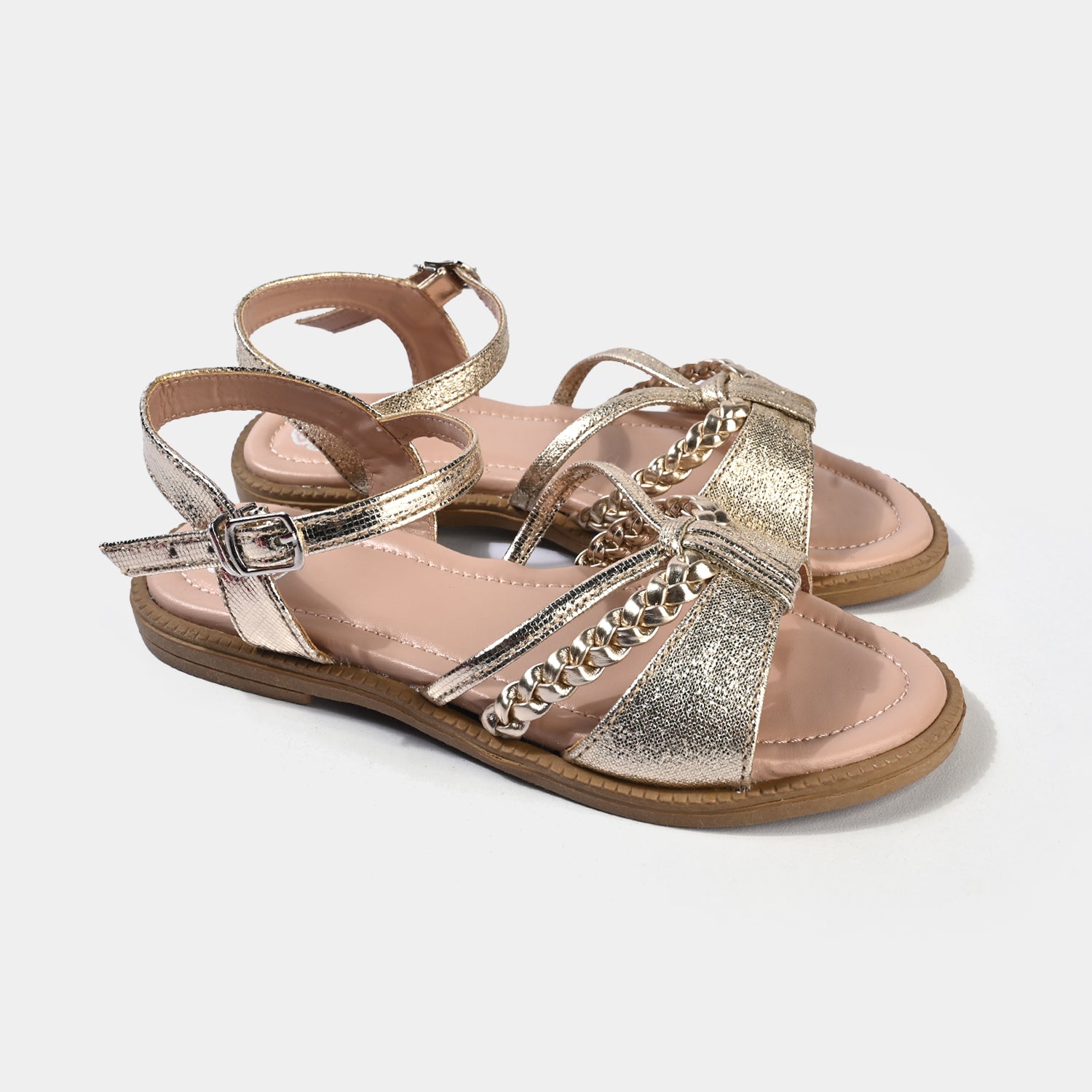 Girls’ golden sandals featuring a secure buckle strap and shiny finish, perfect for occasional or festive wear. Comfortable, stylish, and ideal for special events.