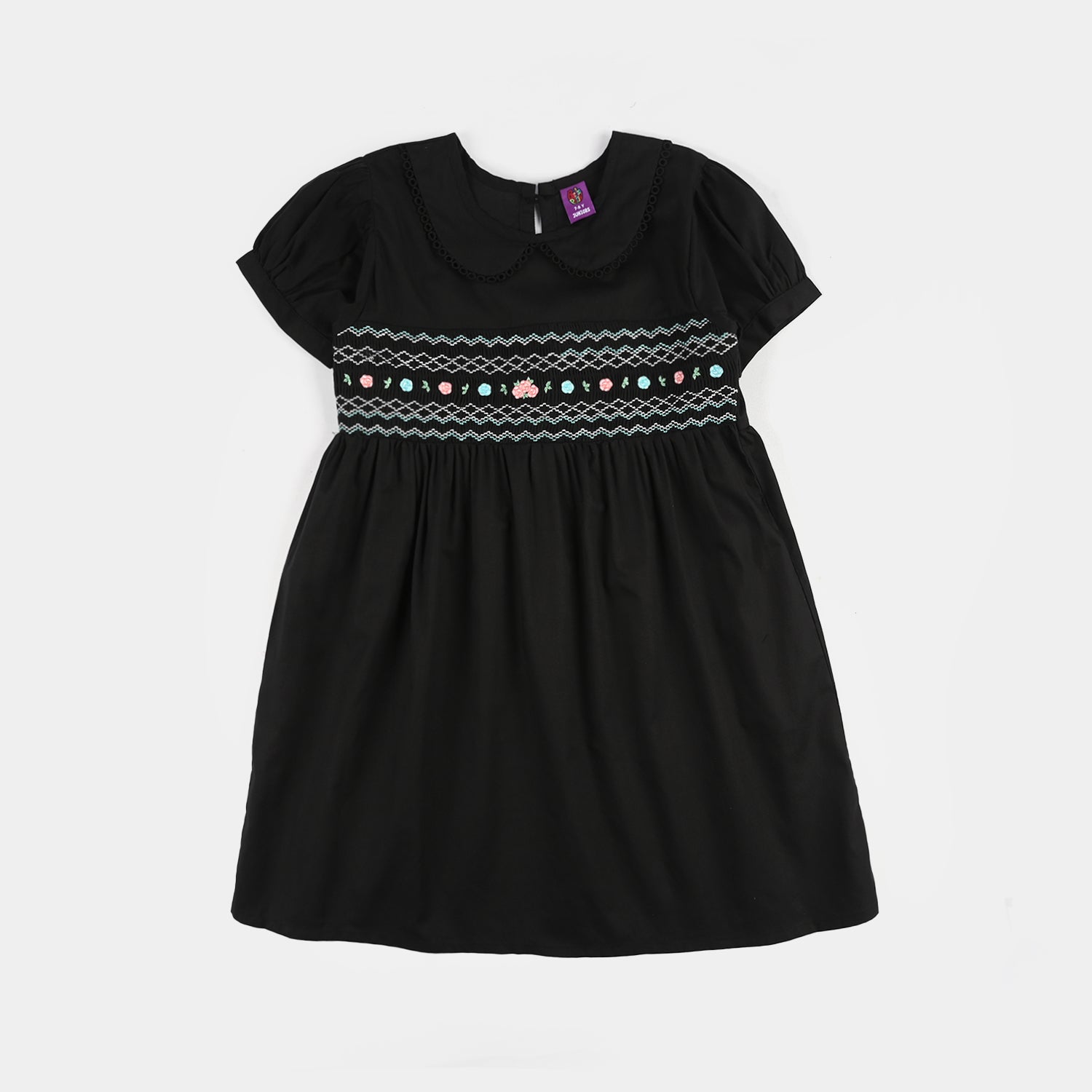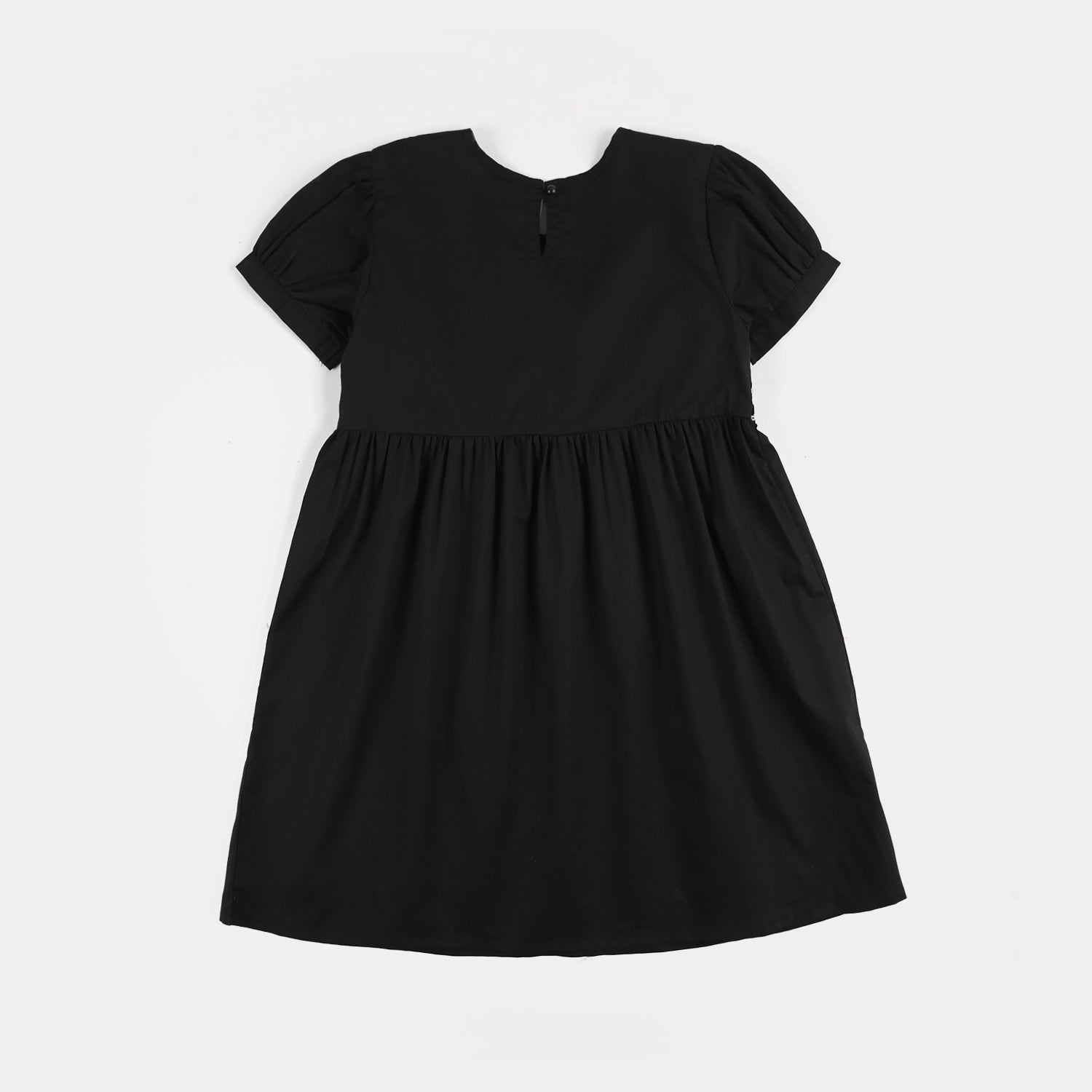 Girls' black cotton frock featuring a round neck, half sleeves, minimal embroidery, and pleated detailing, perfect for a stylish and comfortable everyday look.