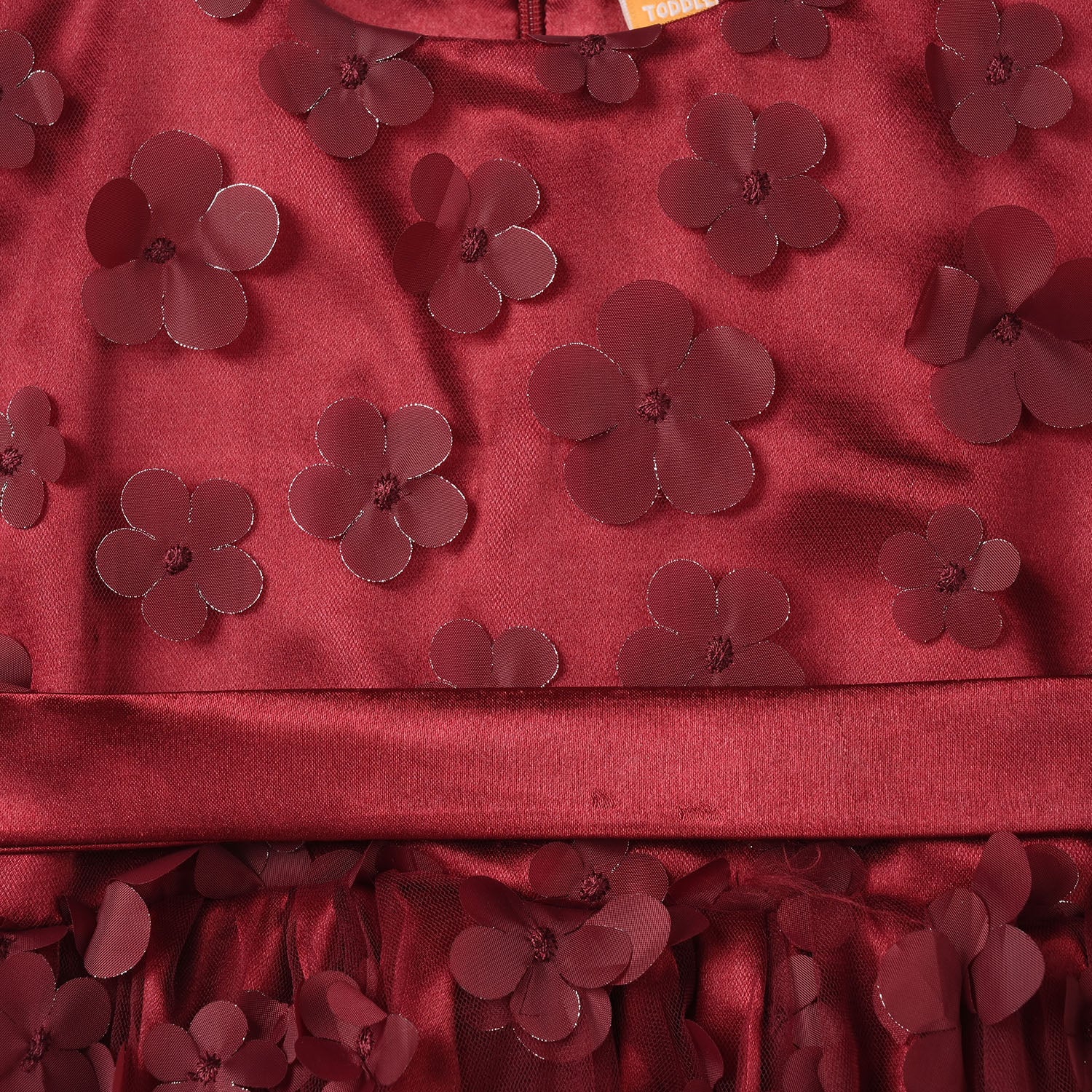 Girls’ fancy net frock in maroon featuring a round neck, sleeveless design, and and floral embellishments, perfect for a stylish and comfortable festive look.