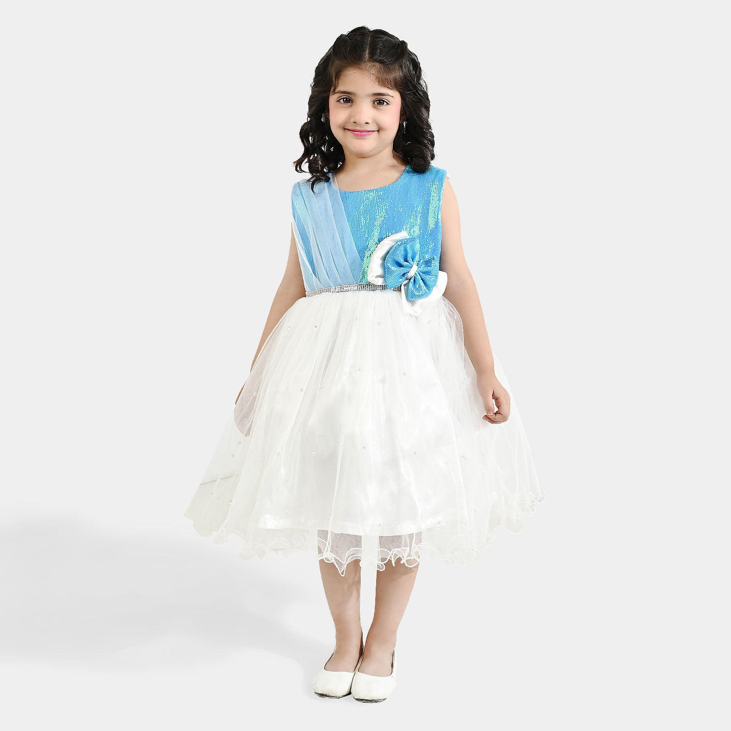Girls’ fancy frock in dreamy blue, featuring sequin detailing, a bow embellishment, and a sleeveless design.