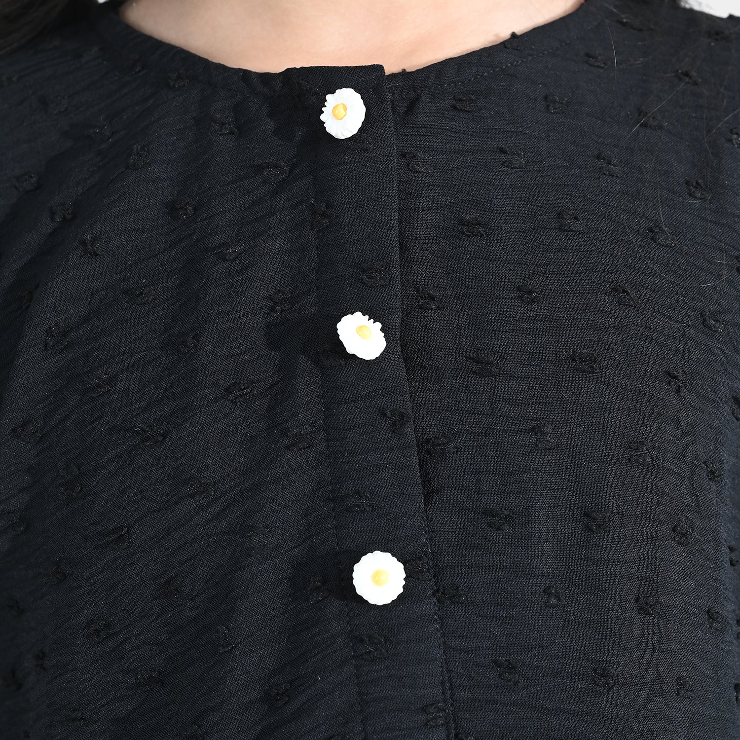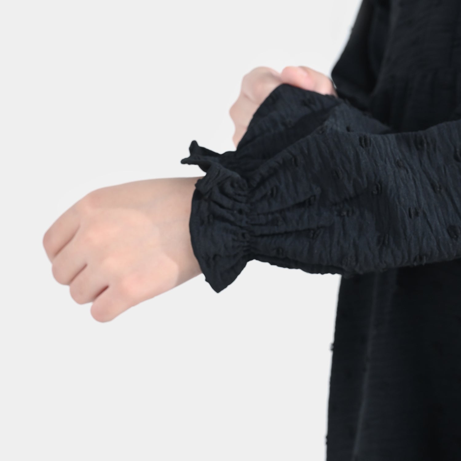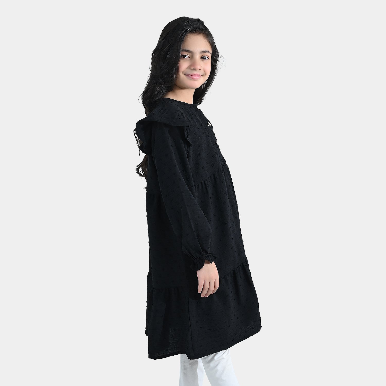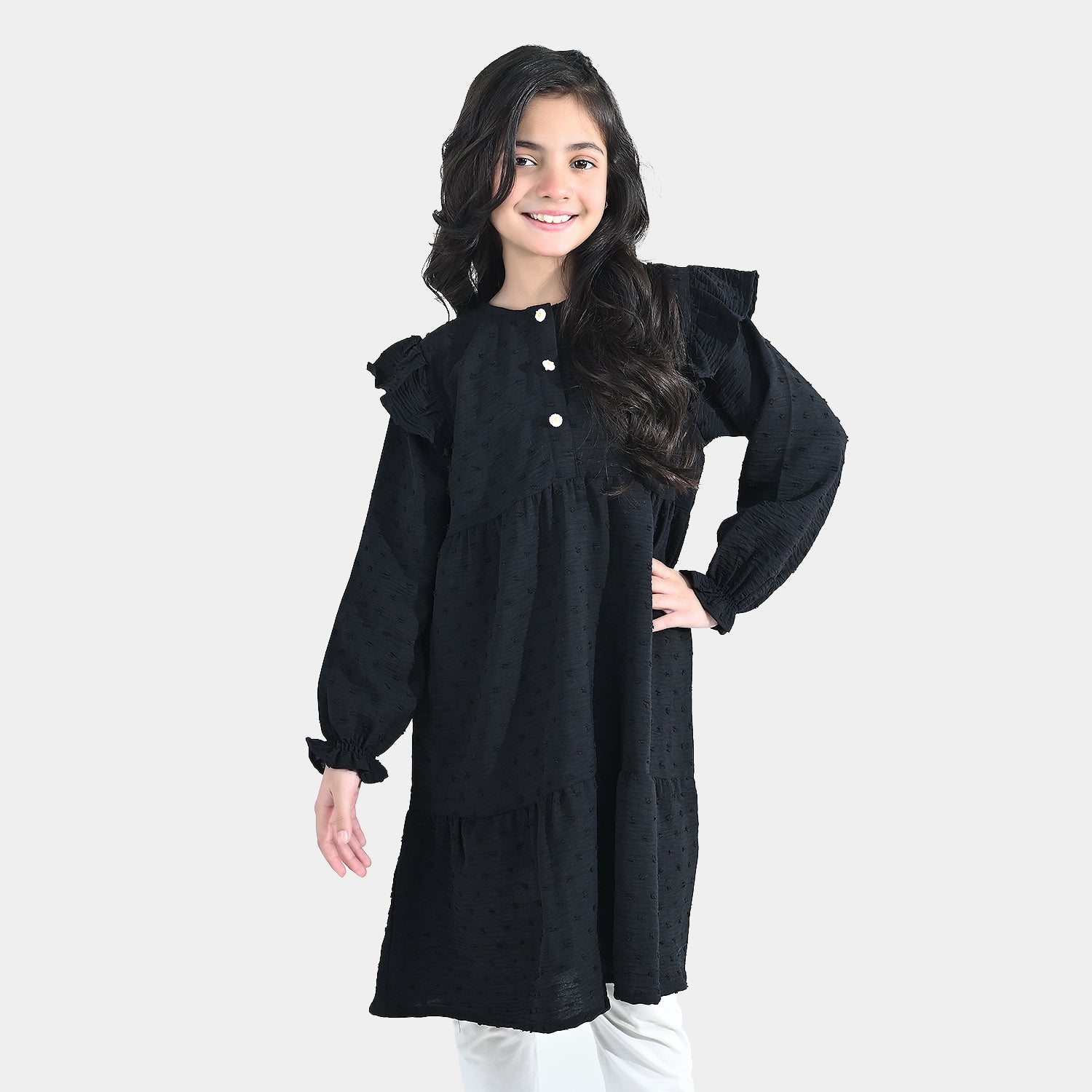 Girls’ cotton casual frock Brochia in black, featuring a buttoned neck for easy wear, ruffle shoulder detailing, full sleeves with elastic hem, and a frock-style fit.