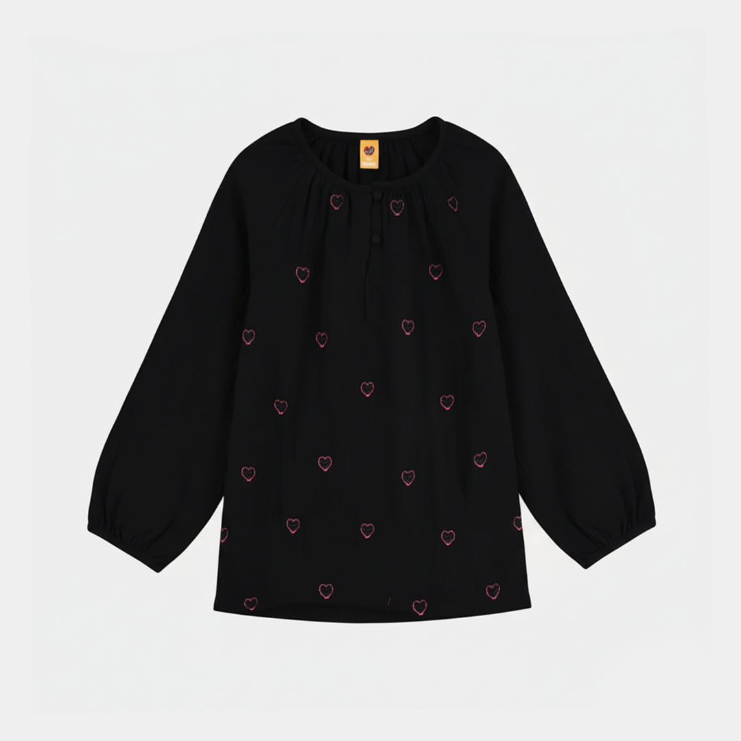 Girls Poly Crinkle Emb Top Pink Hearts - BLACK
