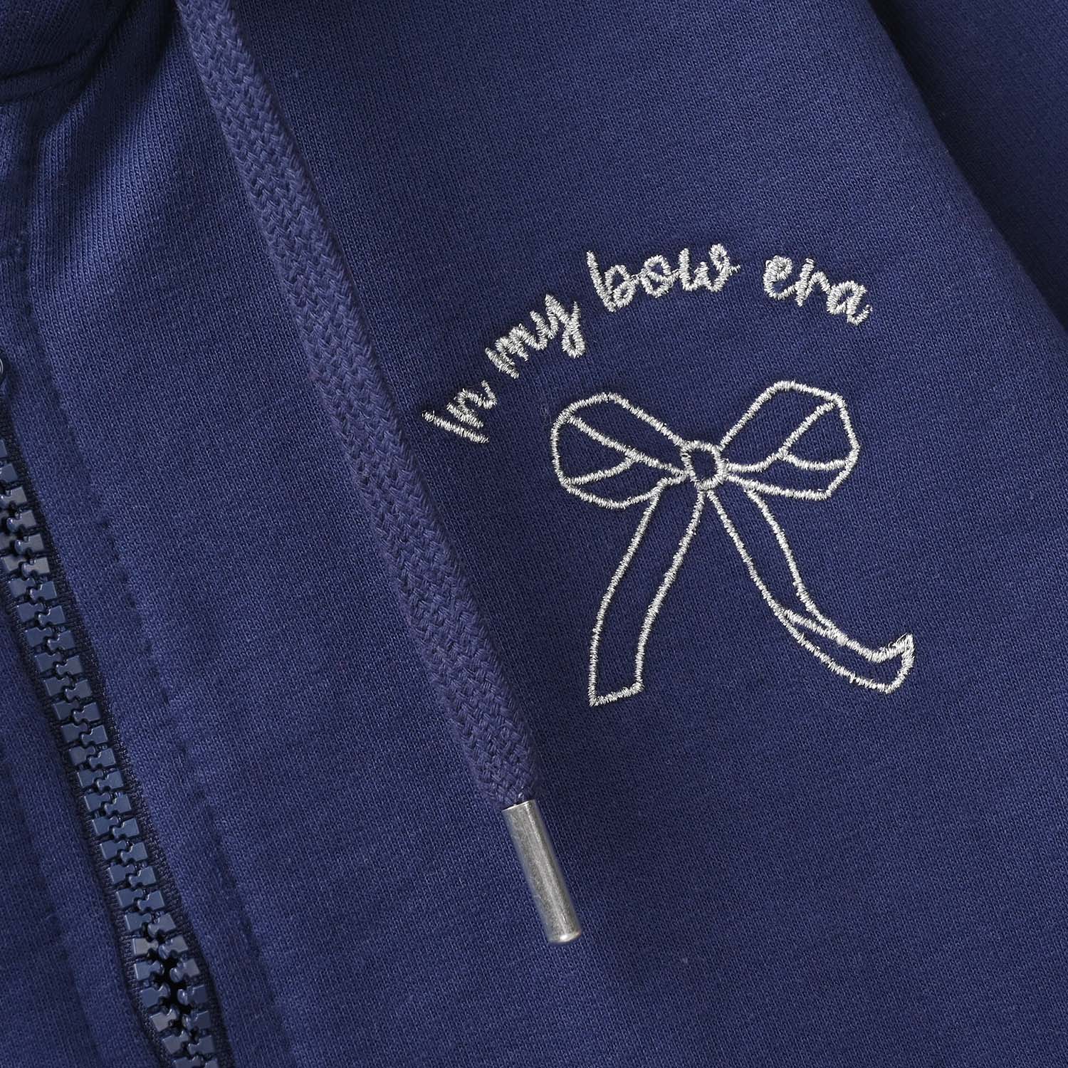 This blue girls 2-piece set includes a zipper hoodie with an attached hood, embroidered bow, and full sleeves, paired with matching wide-leg pants featuring pockets for a comfortable, stylish look.