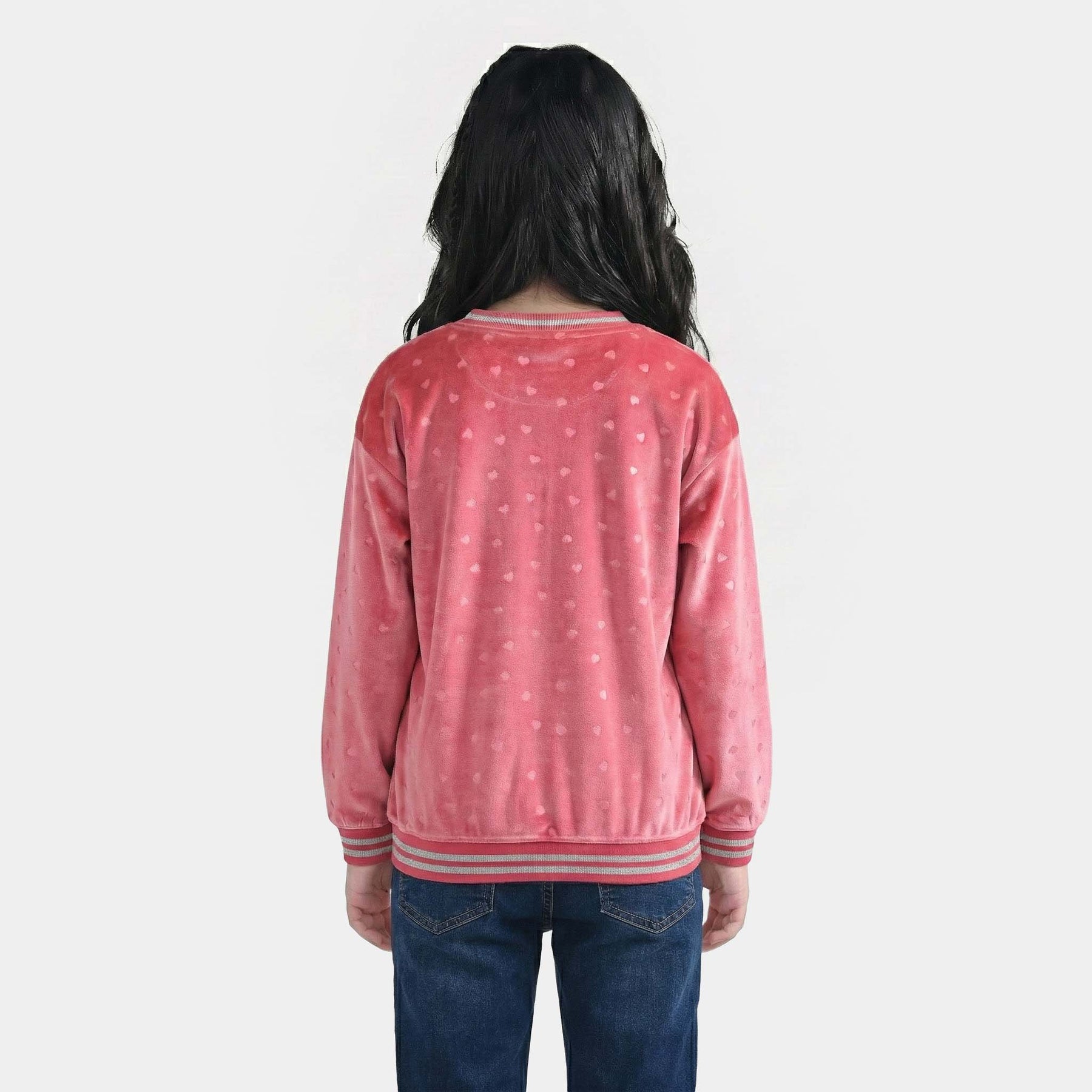 Infant girls’ pink sweatshirt in soft plush, featuring embossed hearts, full sleeves, and a round neck. Cozy, comfortable, and easy to pair with any bottoms.