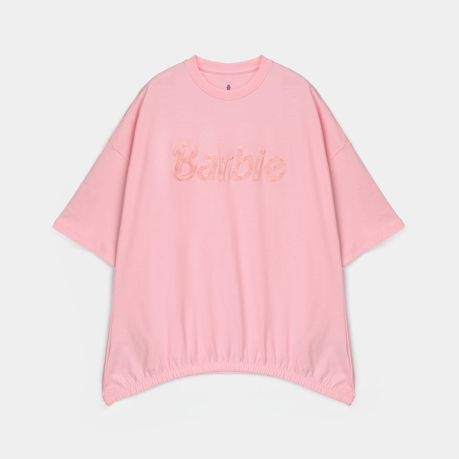 Girls pink shirt featuring a front "Barbie" text print, loose fit with elastic hem, and half sleeves, perfect to pair with any bottoms for an everyday look.