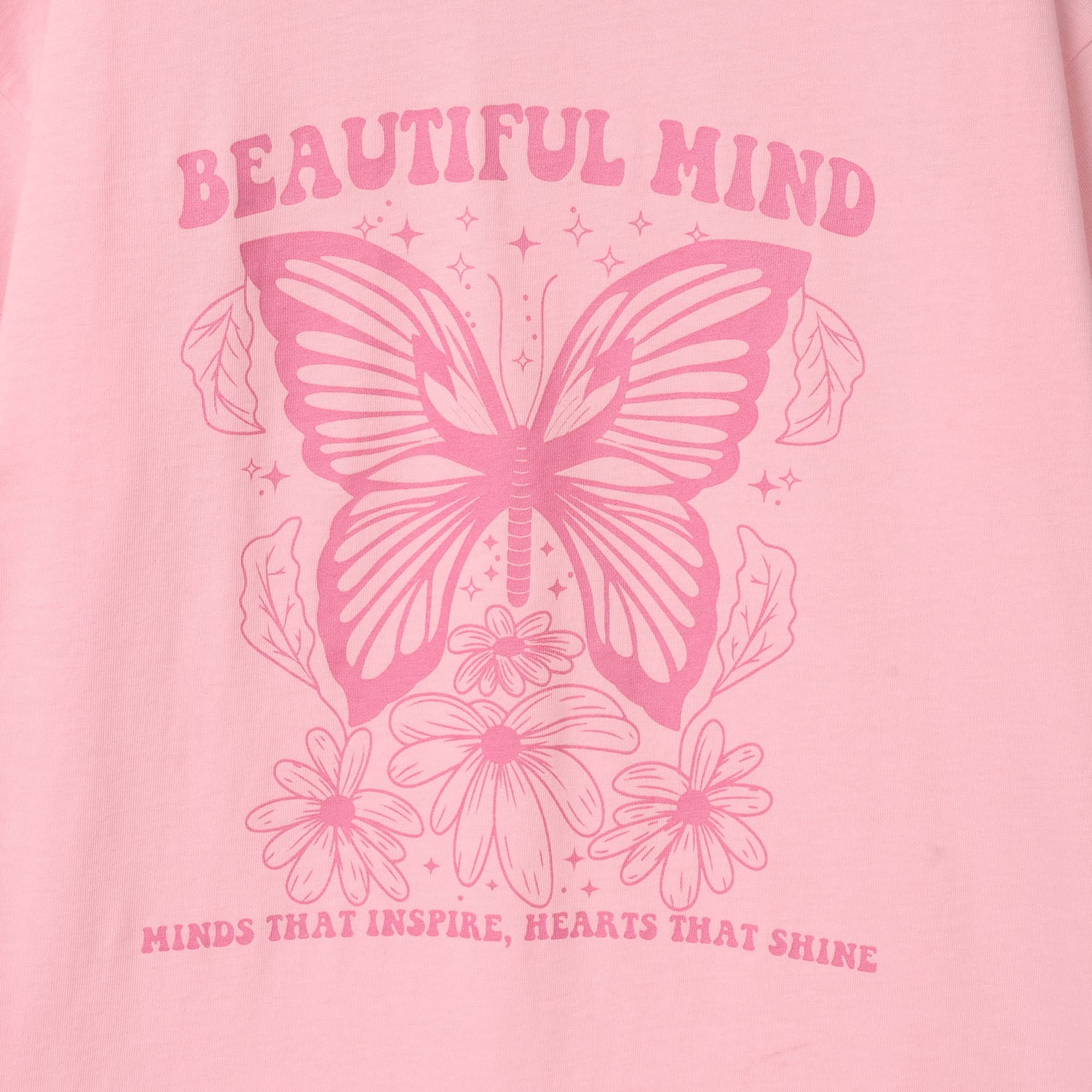 Girls pink shirt featuring a front "Butterfly" print and half sleeves, perfect to pair with any bottoms for a cute and stylish everyday look.