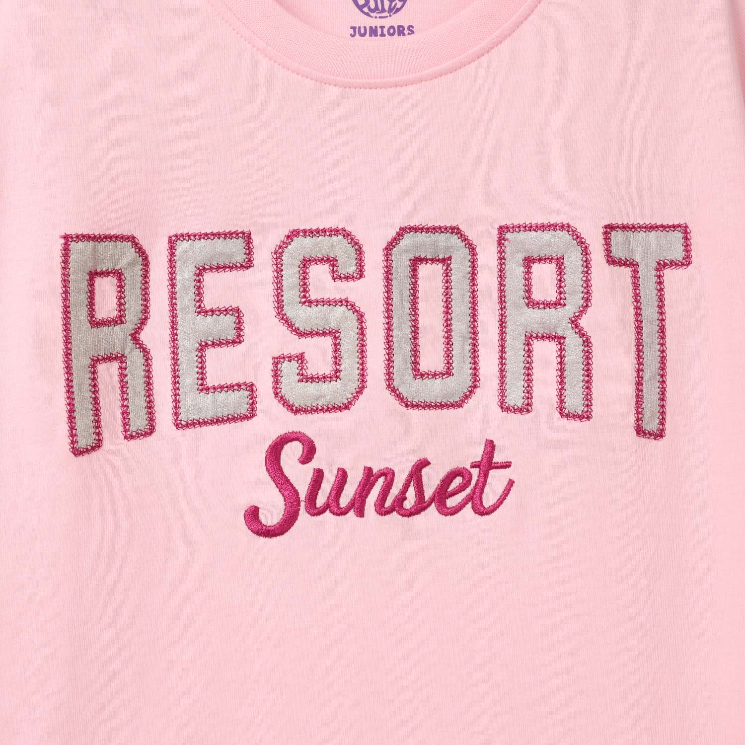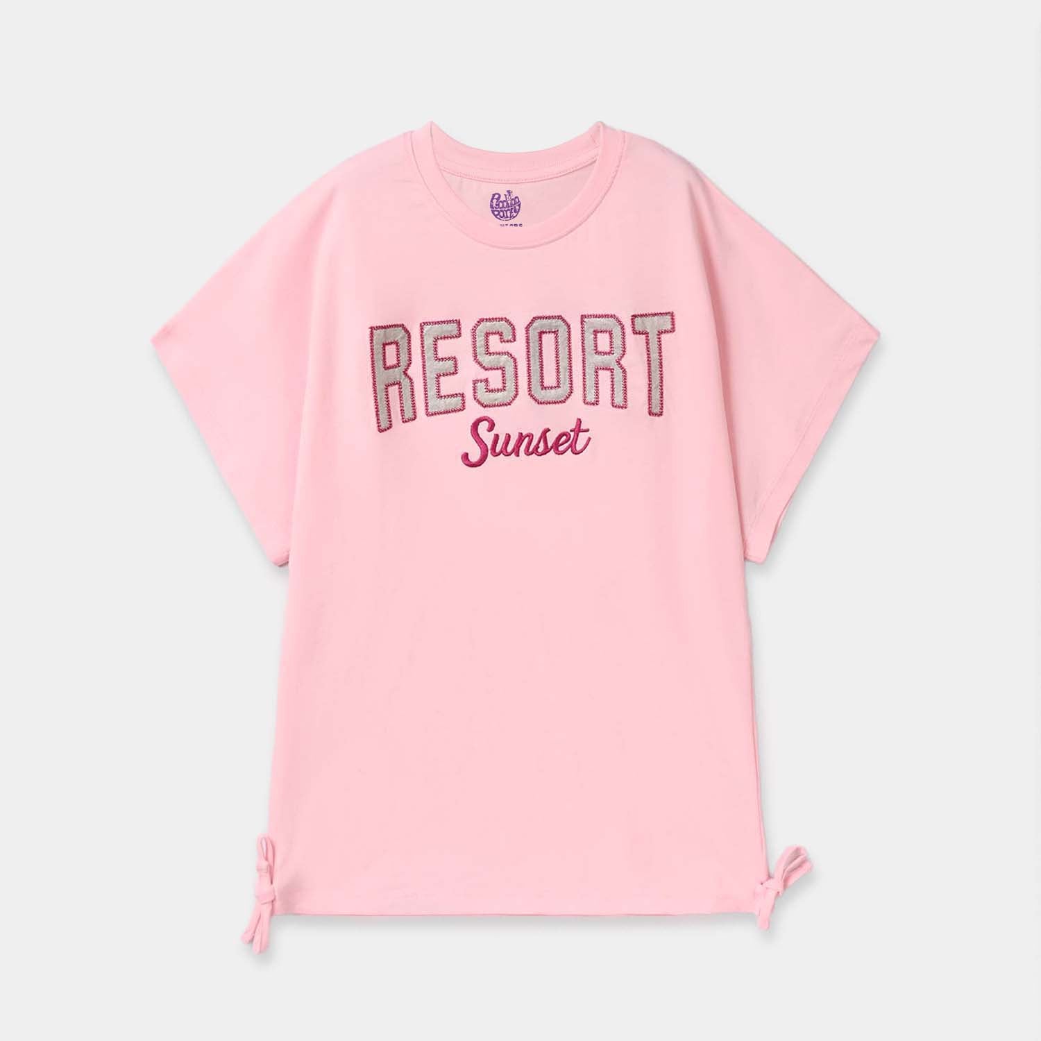 Girls pink shirt featuring front “Resort Sunset” embroidery, half sleeves, and cute side bows on the hem. Easy to pair with any bottoms for a stylish everyday look.