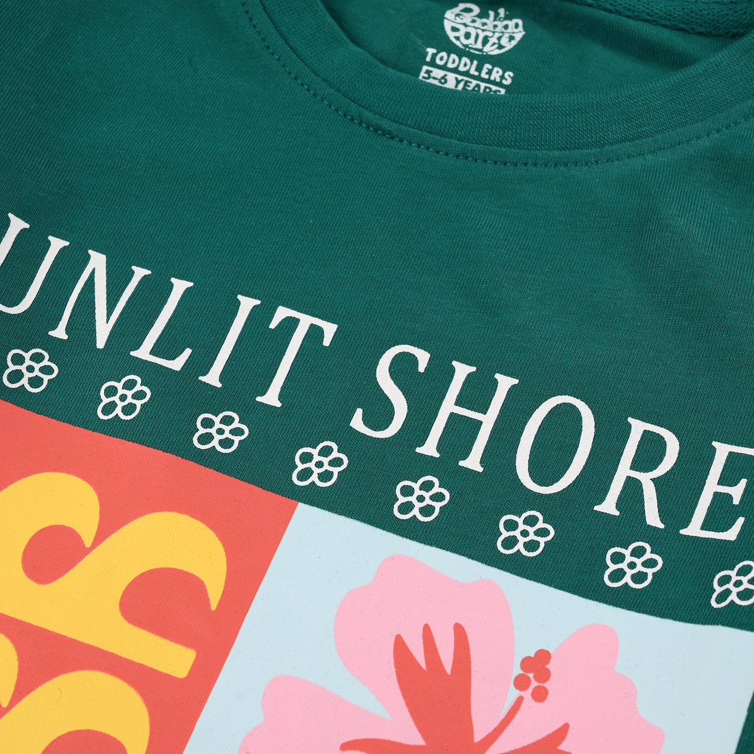 Girls’ jersey/terry T-shirt in quiet green, featuring a round neck, half sleeves, and “Sunlit Shores” front graphic.