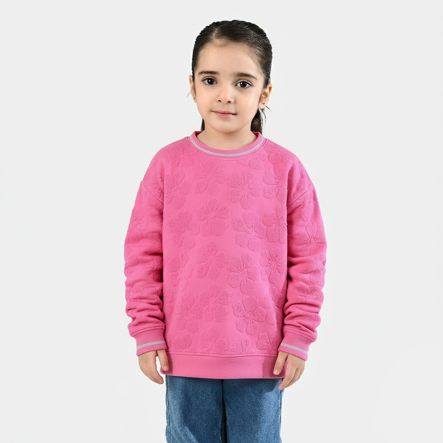 Girls Jacquard T-Shirt in Pink featuring a floral embossed texture with a round neck and full sleeves, finished with a neat hem for a stylish and comfortable everyday look.