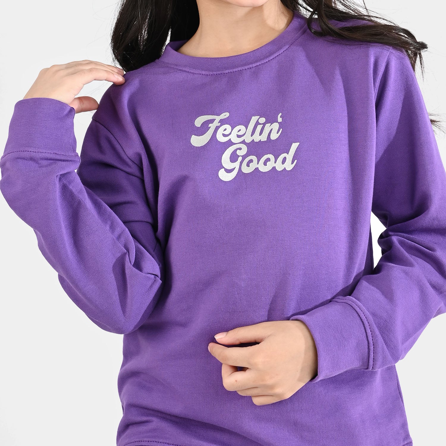 Purple two-piece suit for girls featuring a “Feeling Good” print, made from a soft jersey and terry fabric combination with coordinating bottoms for a polished, comfortable look.
