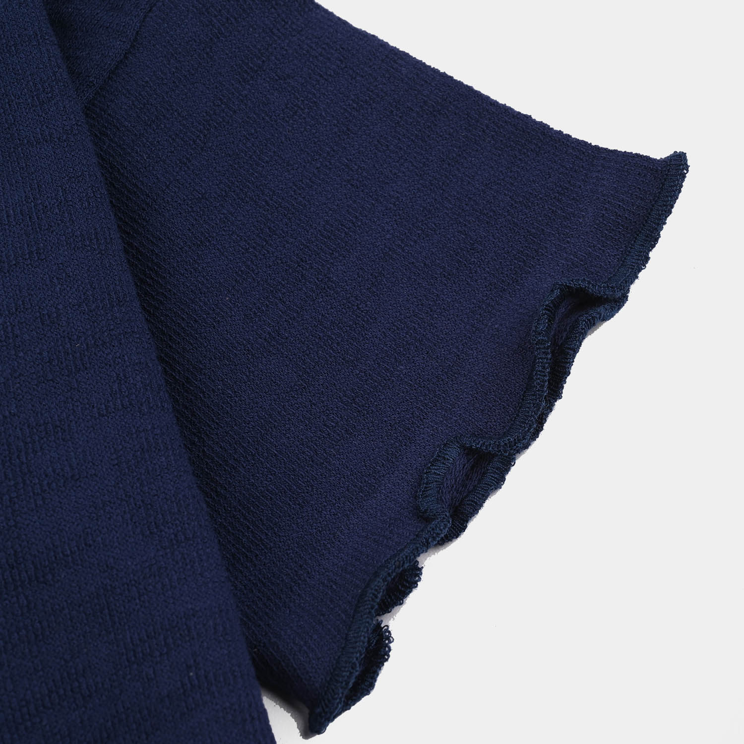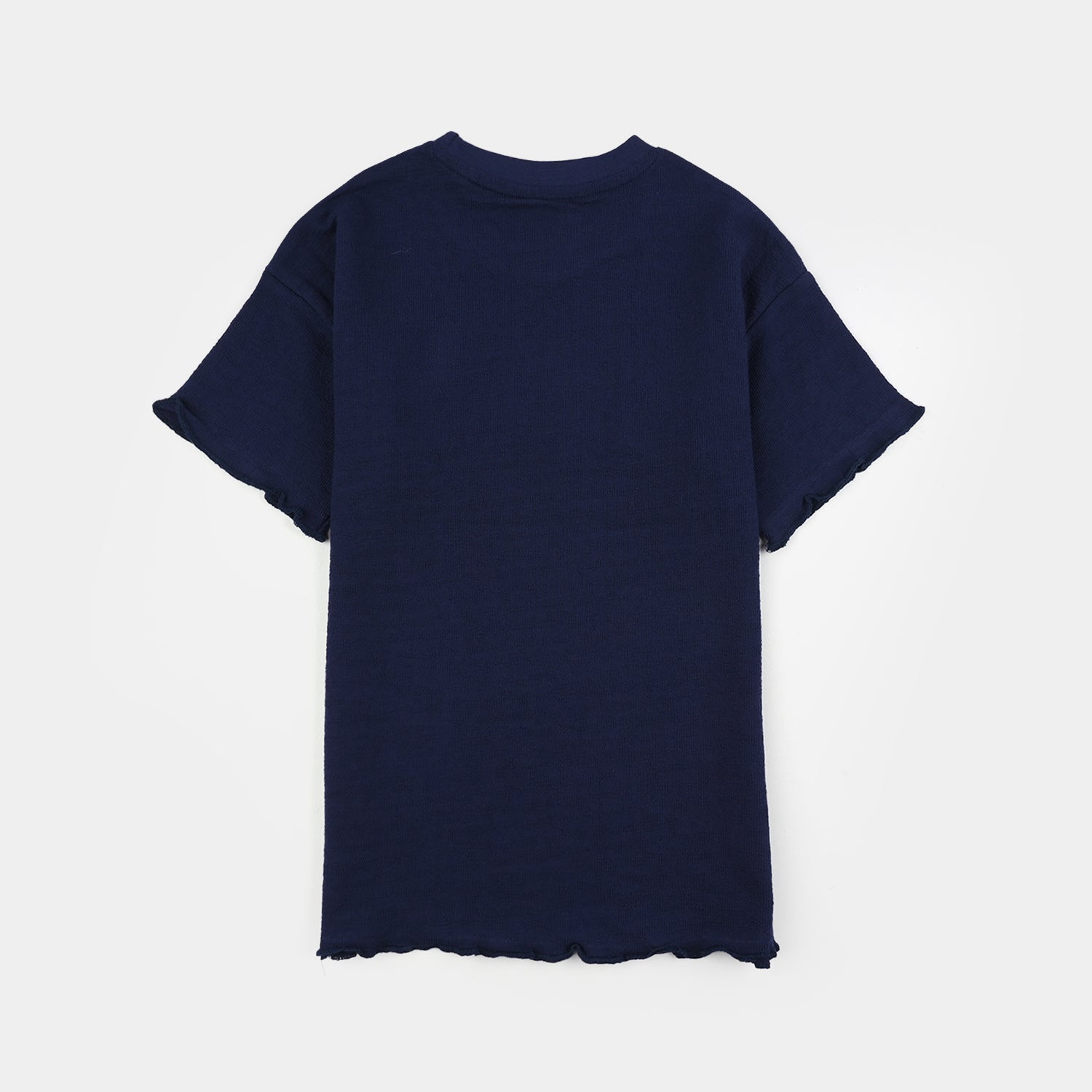 Girls navy blue jersey/terry T-shirt featuring a round neck, half sleeves, and front floral print, perfect to pair with any bottom for a complete everyday look.