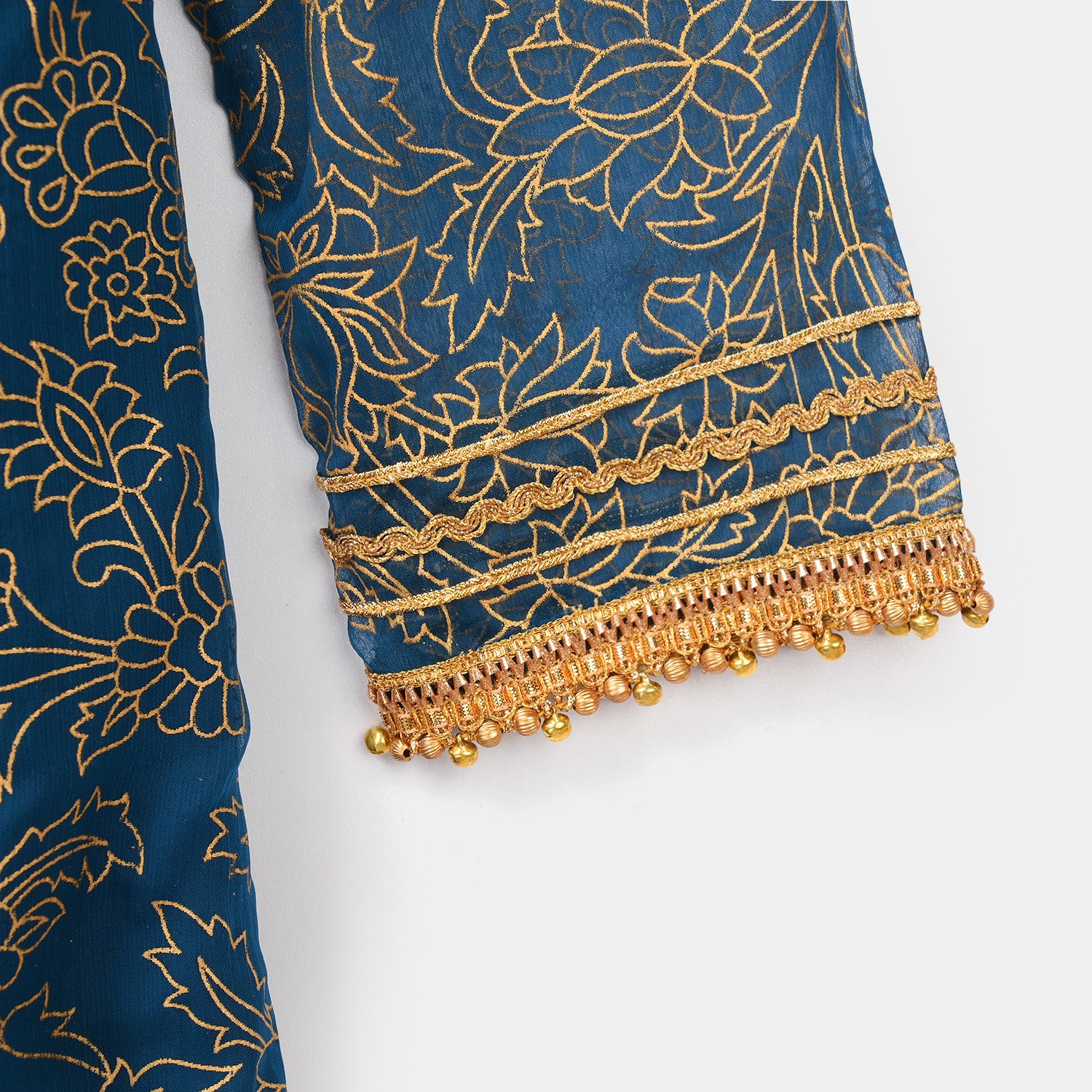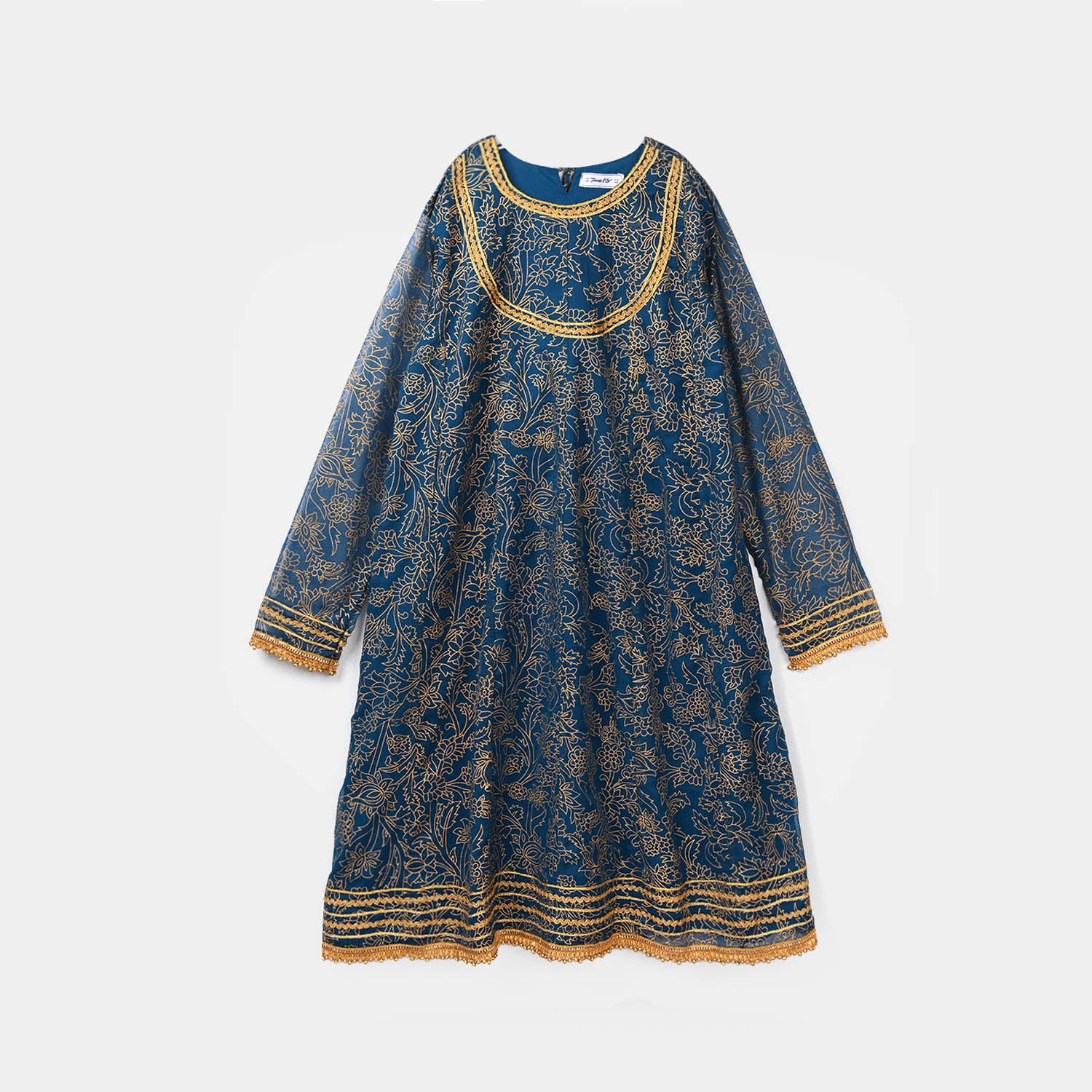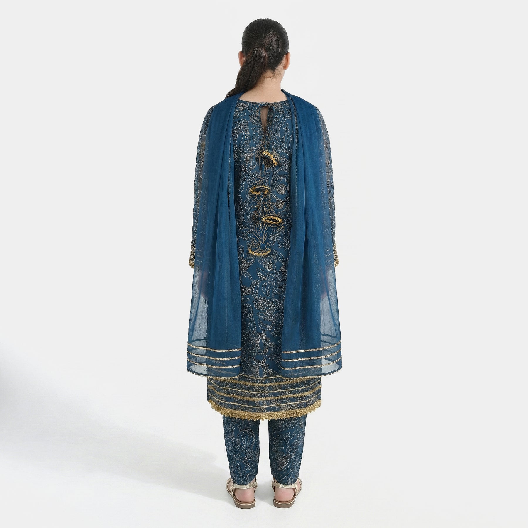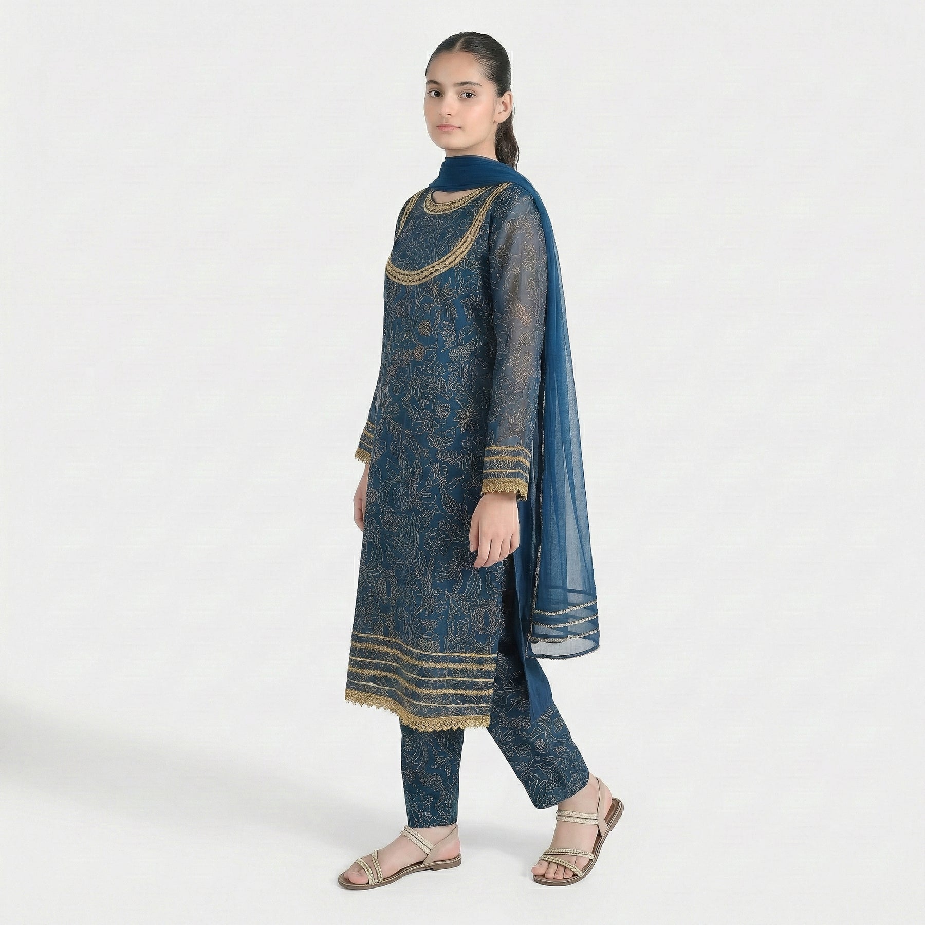 Girls' 3-piece chiffon suit features a round neck with lace detailing, full sleeves, matching bottoms, and a dupatta with lace accents for an elegant festive look.