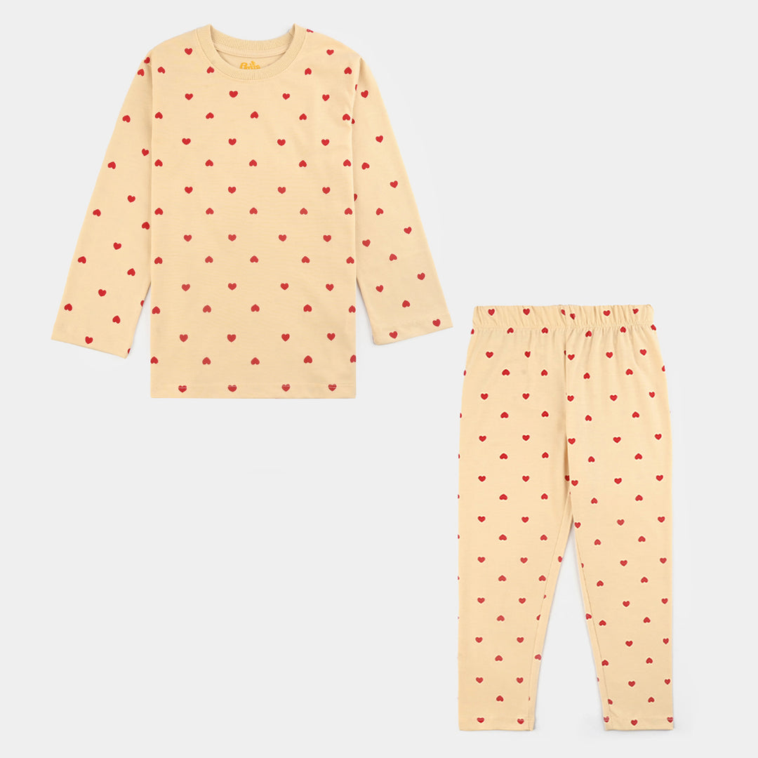Girls Cotton Interlock Night Suit Hearts-Wood Ash