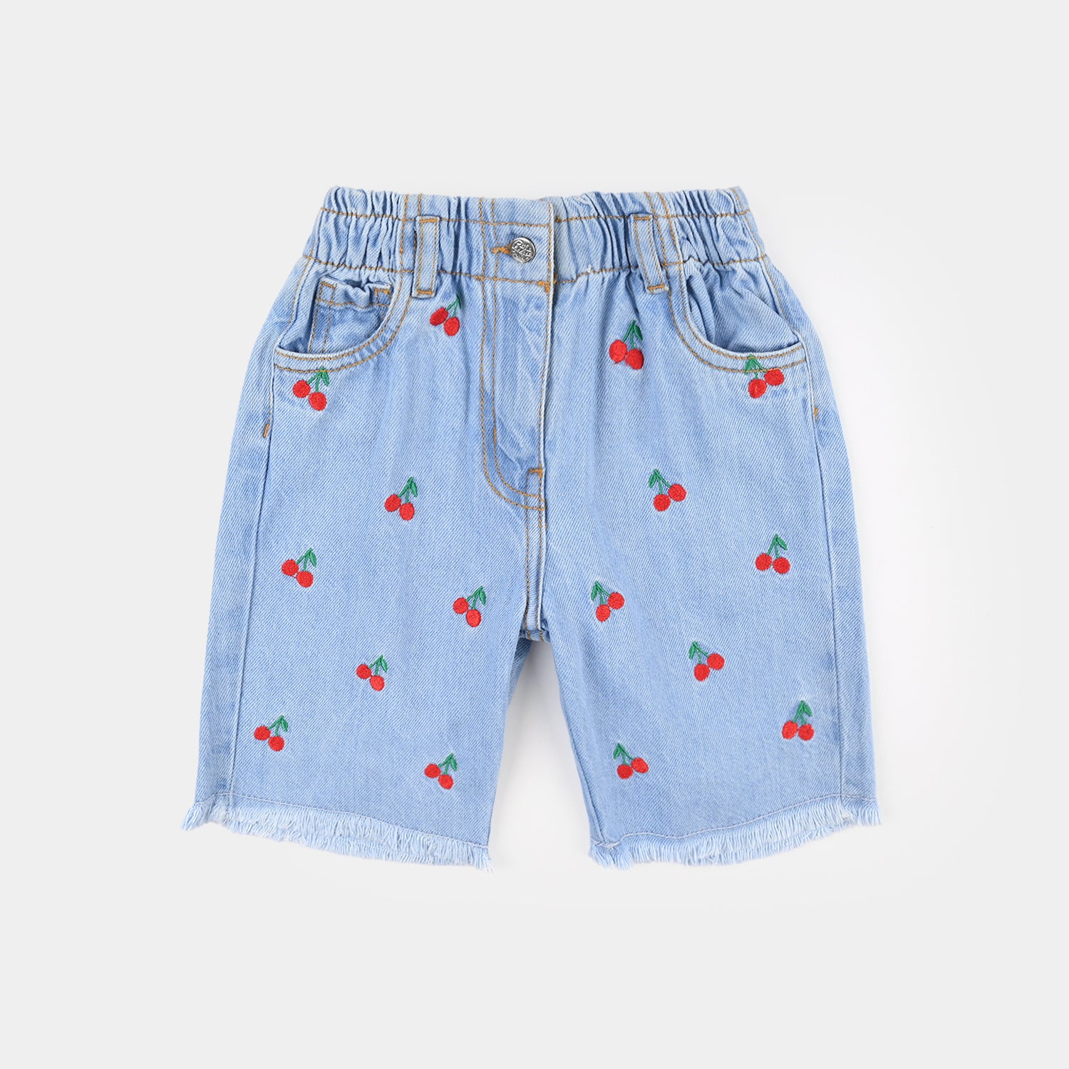 These light blue rigid denim shorts feature embroidered cherry detailing, offering soft and comfortable wear for girls.