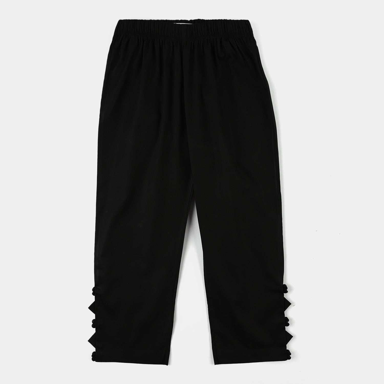 Girls’ cotton pants in black, featuring triangle detailing on the sides for a stylish look. Comfortable and perfect for everyday wear.