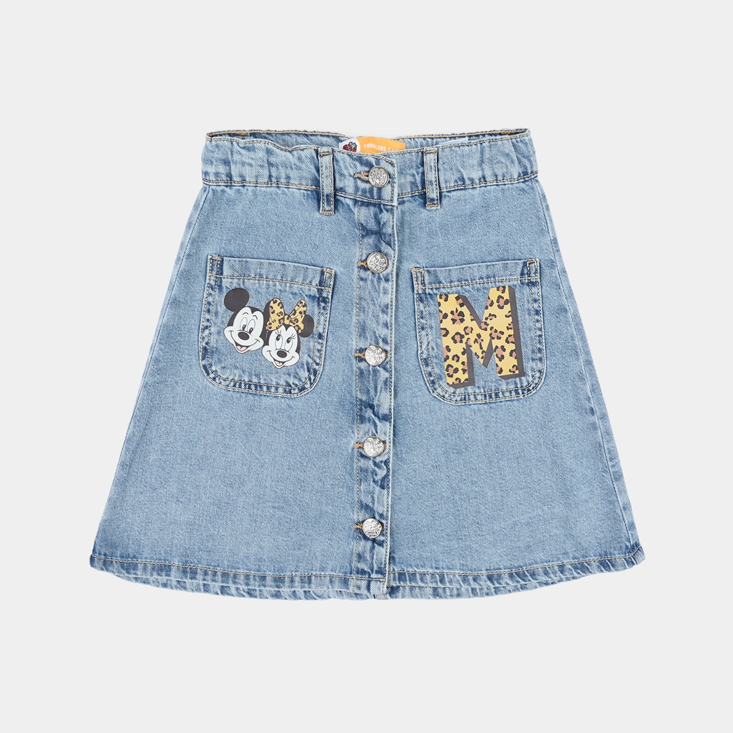 Girls' rigid denim skirt in light blue featuring a Mickey and Minnie character print, front button opening, durable denim fabric, and comfortable fit, perfect for everyday wear and casual outings.
