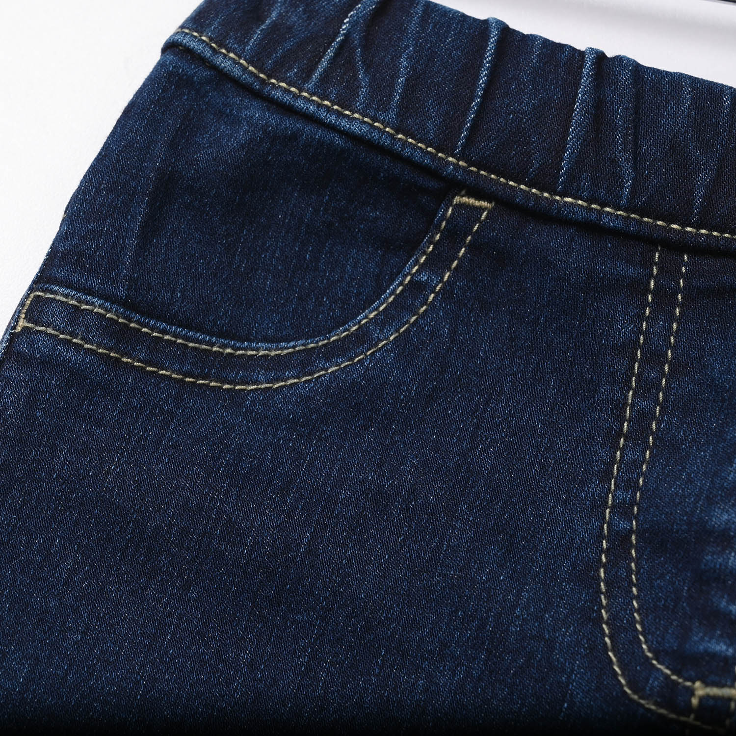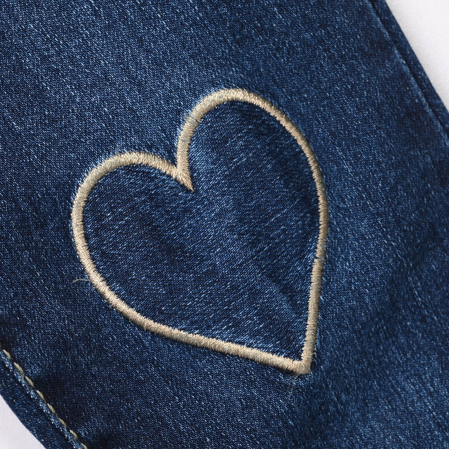 Girls’ denim stretch jeggings in dark blue, featuring heart embroidery on the knees and a comfortable fit for everyday style.