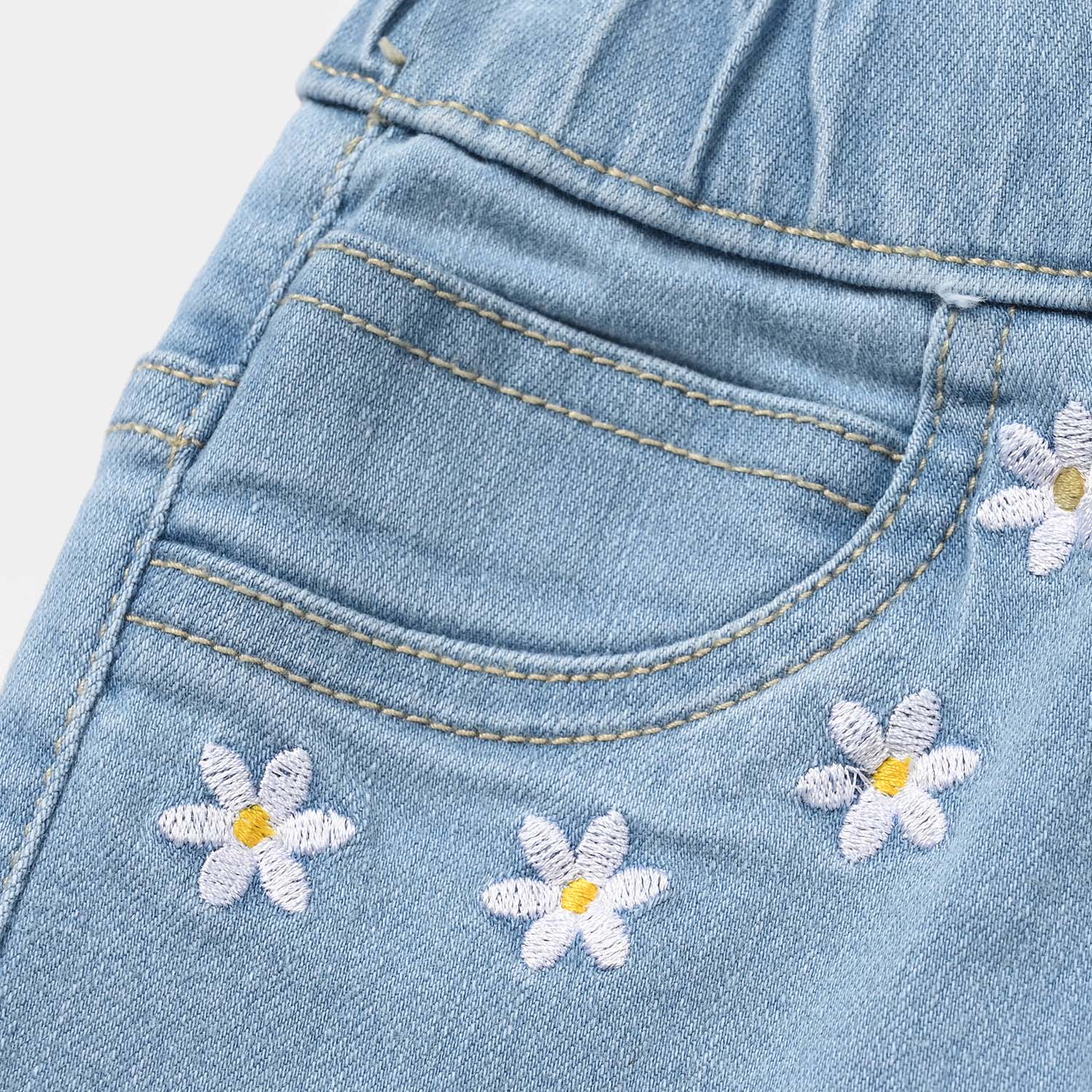 Girls’ denim viscose pants/jeggings in light blue, featuring a comfortable fit with pockets and embroidery on pockets for everyday style.