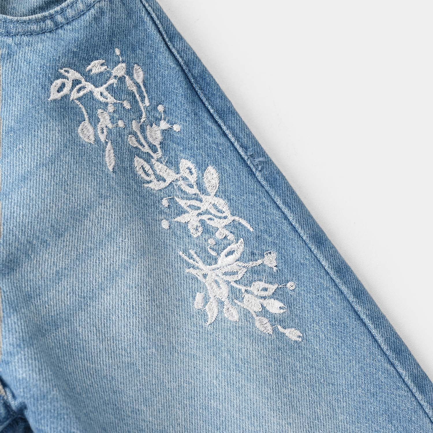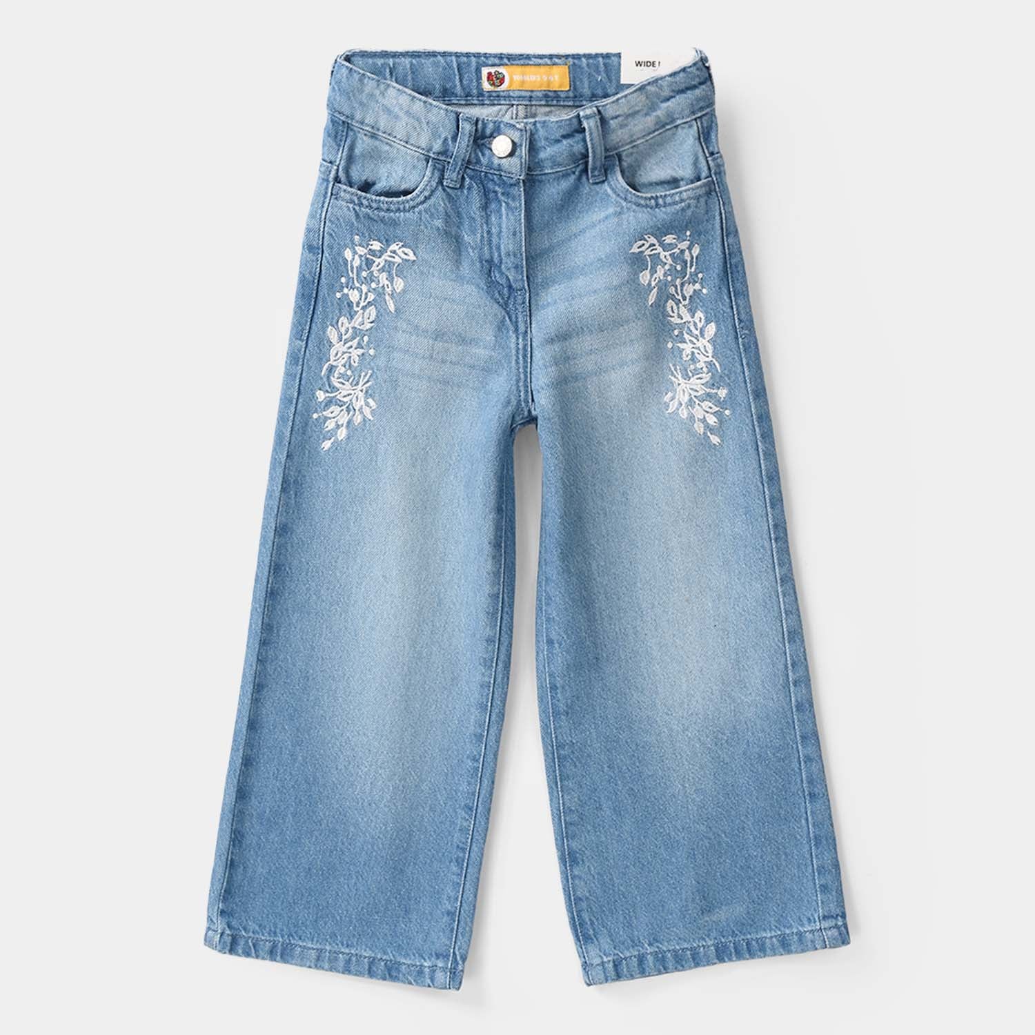 Girls’ denim viscose pants in light blue, featuring a wide-leg fit and leaf embroidery detailing.