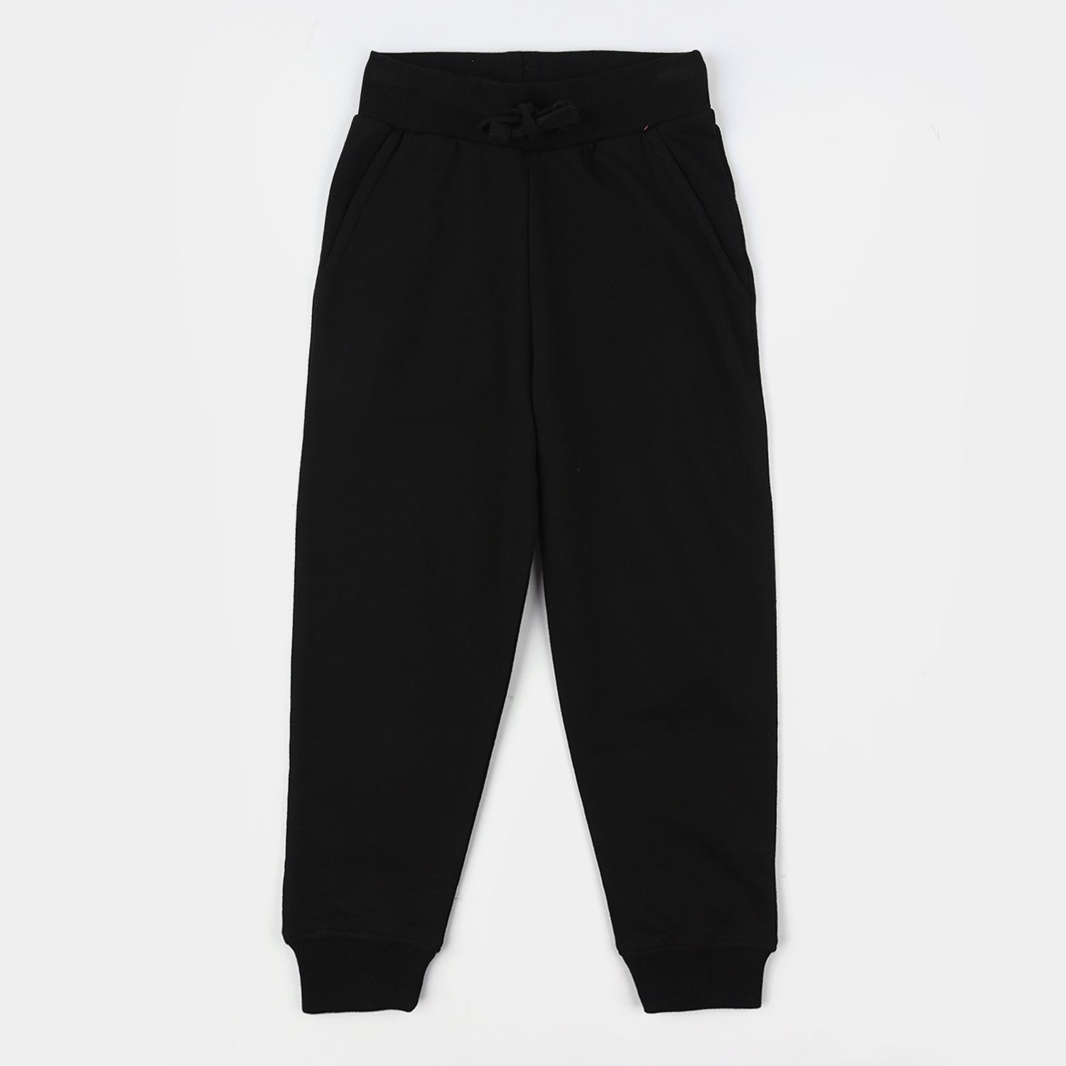 Girls’ jersey/terry pajama in jet black featuring soft stretch fabric, elastic waistband, and relaxed fit, perfect for a comfortable and cozy everyday look.
