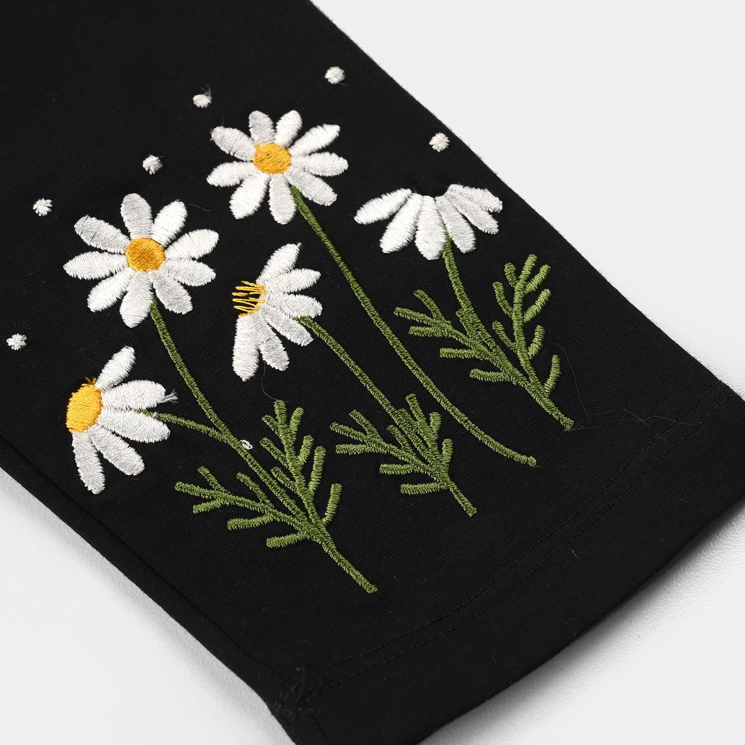 These black Lycra jersey tights for girls feature embroidered daisy detailing, perfect for a comfortable and stylish everyday look.