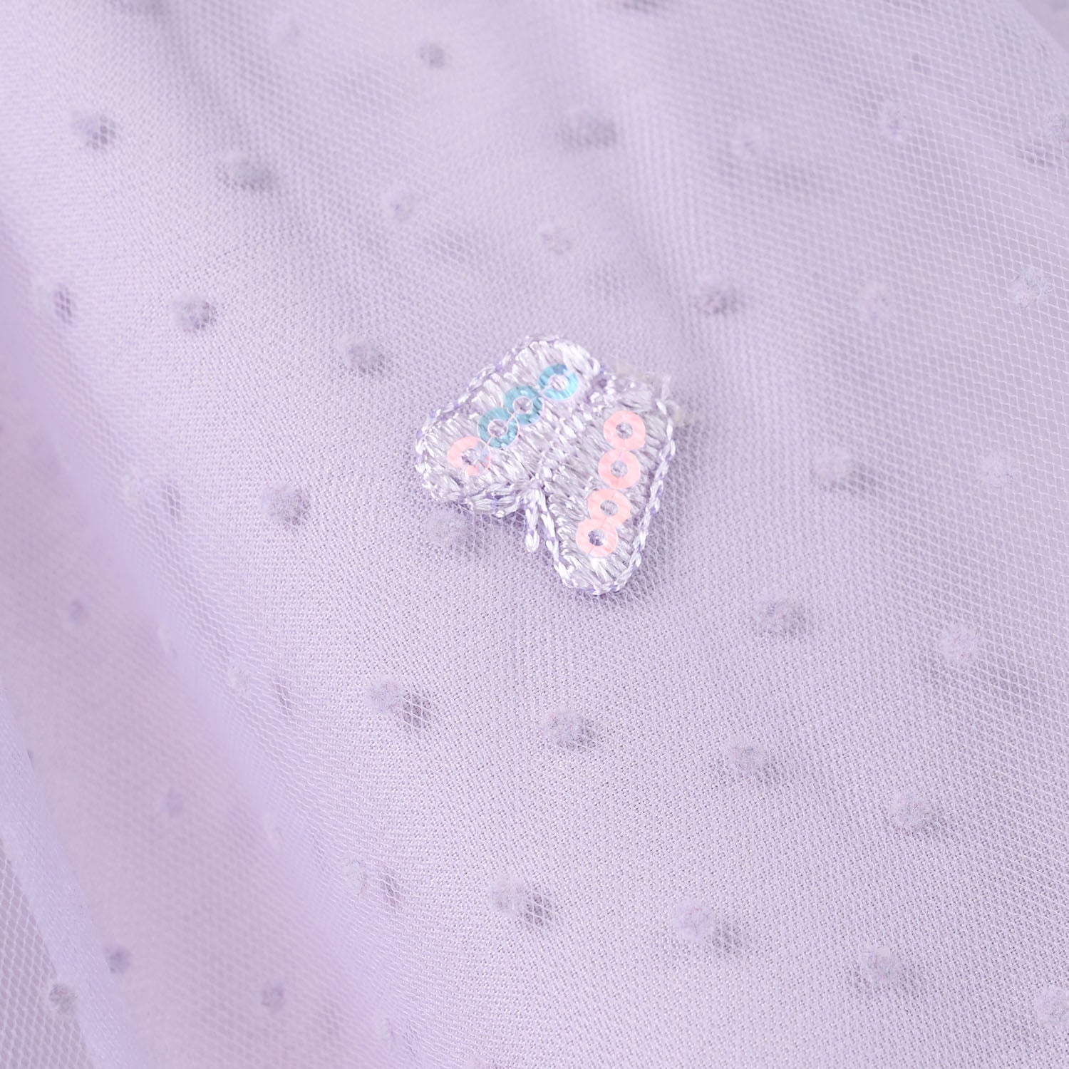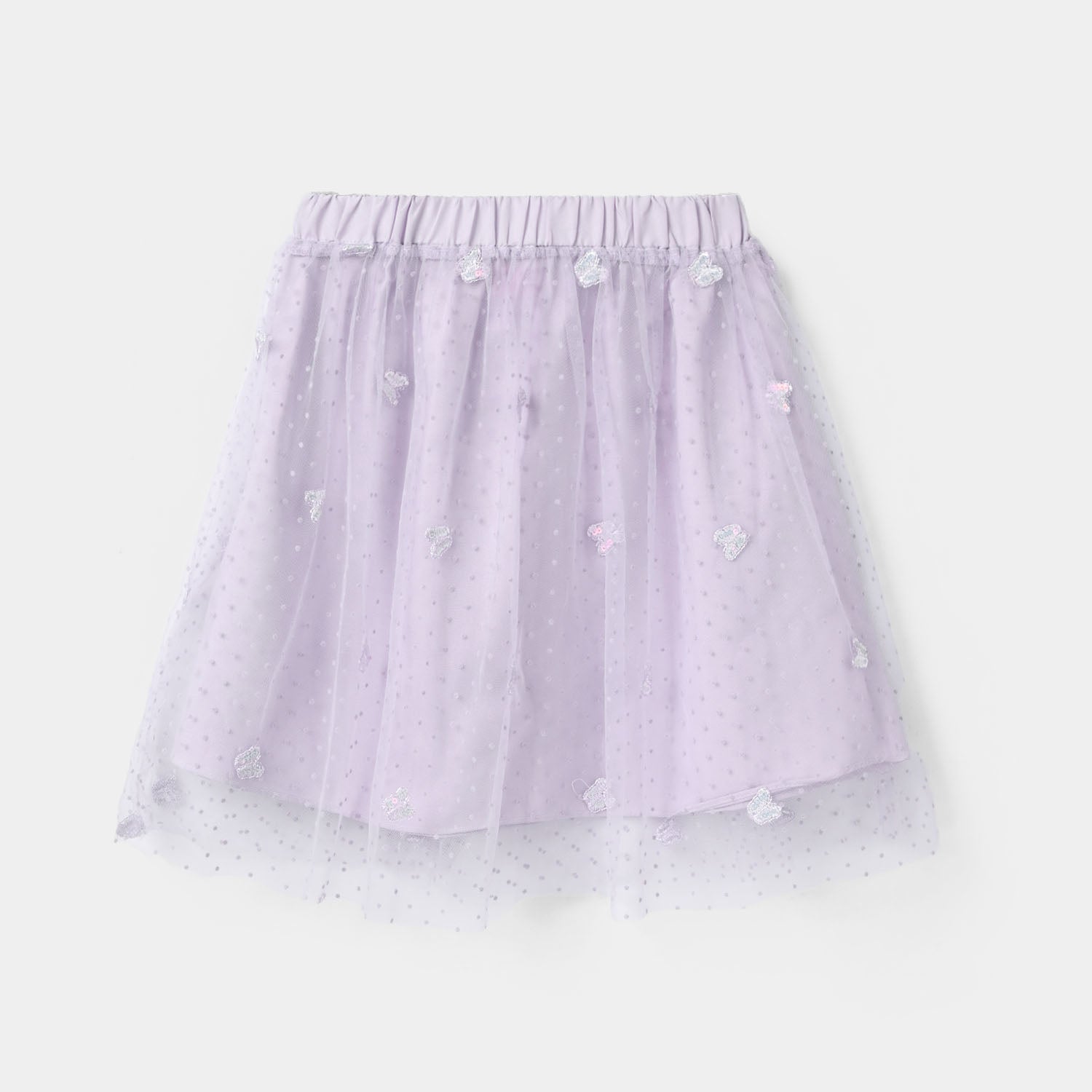 Purple/lilac short net skirt for girls with polka dot print and butterfly embellishments, easy to pair with any top for a cute, playful look.