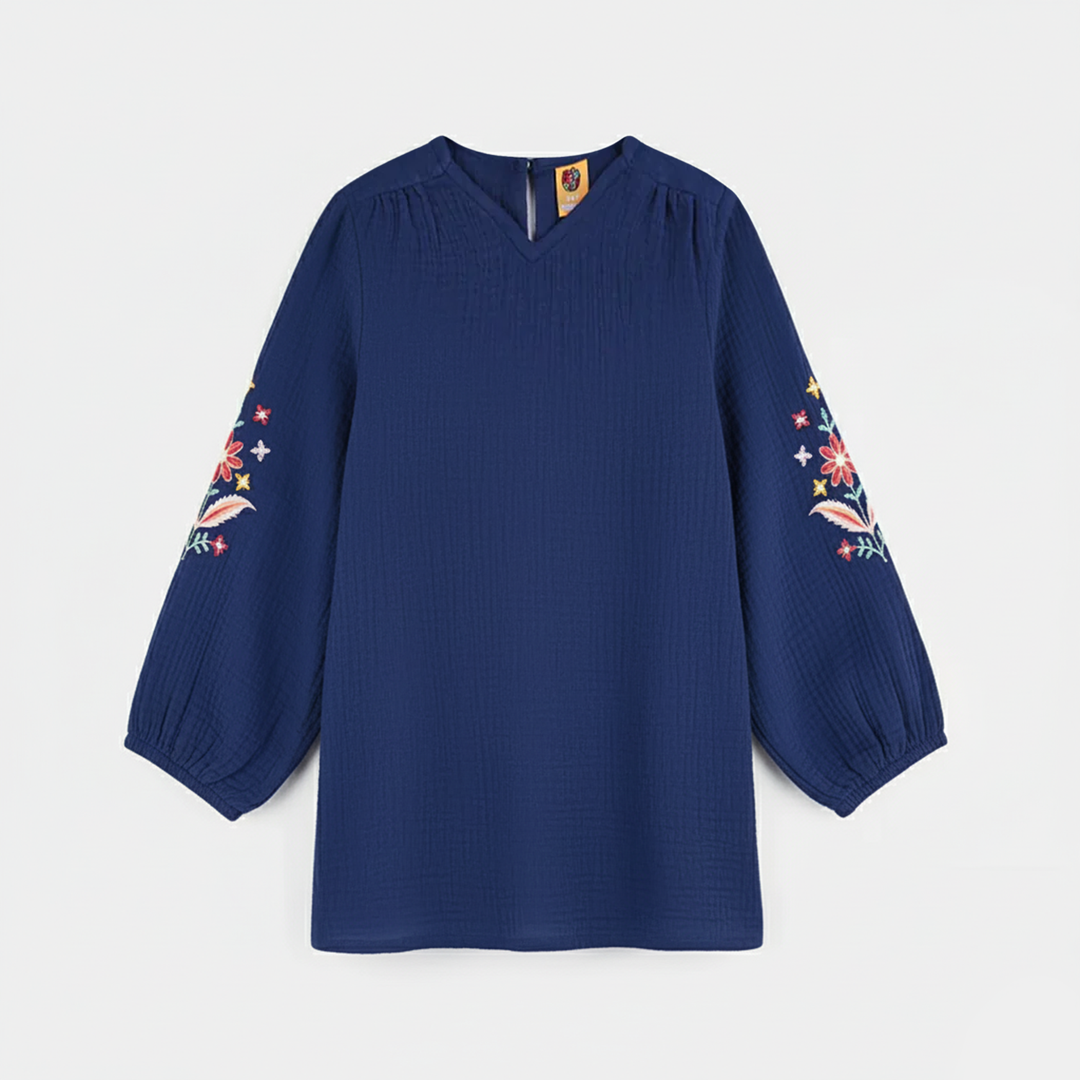 Girls Poly Cotton Emb Top Colorful Hearts-Blue