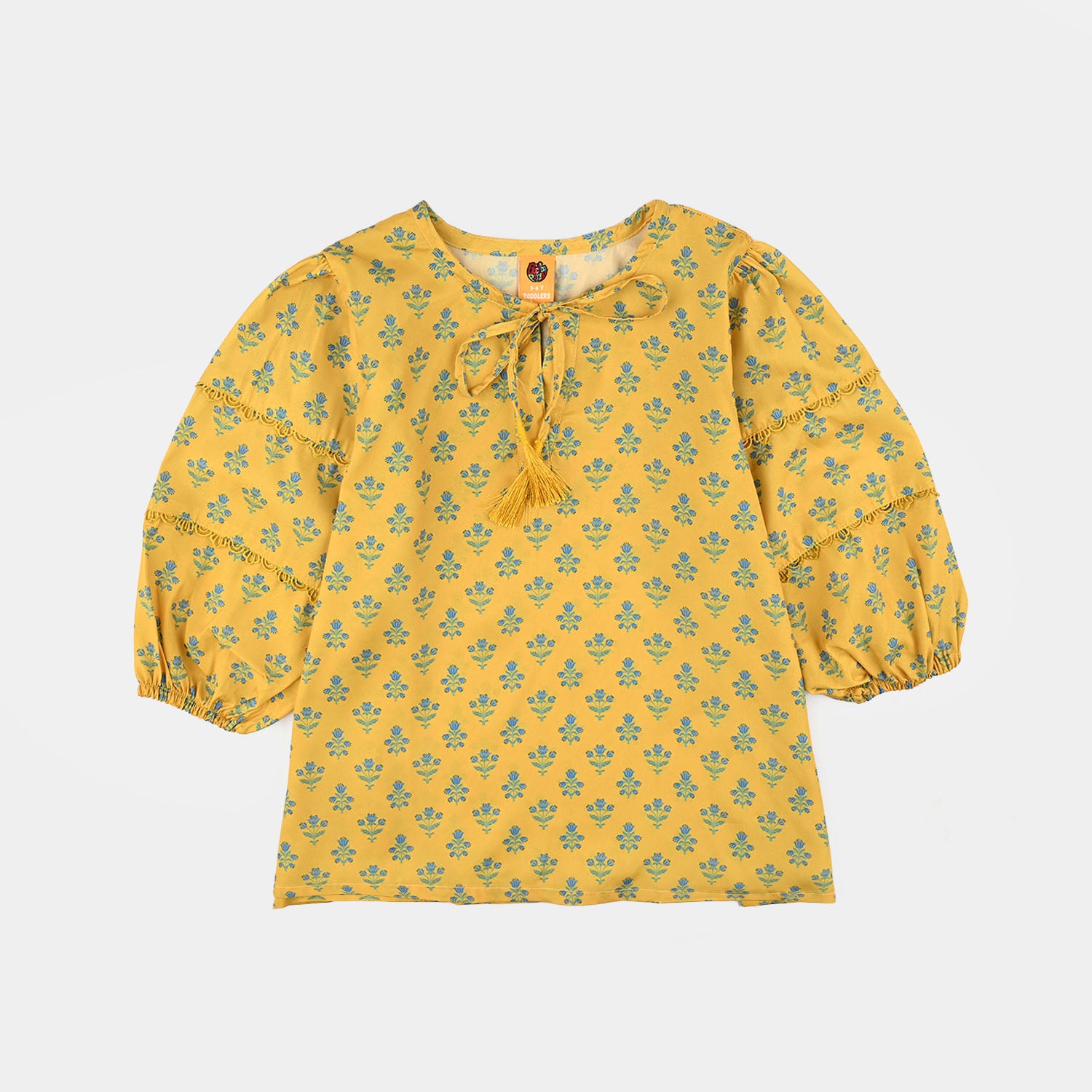 This yellow printed kurti top features full sleeves with an elastic hem and can be paired with jeans or trousers for a comfortable, stylish look.