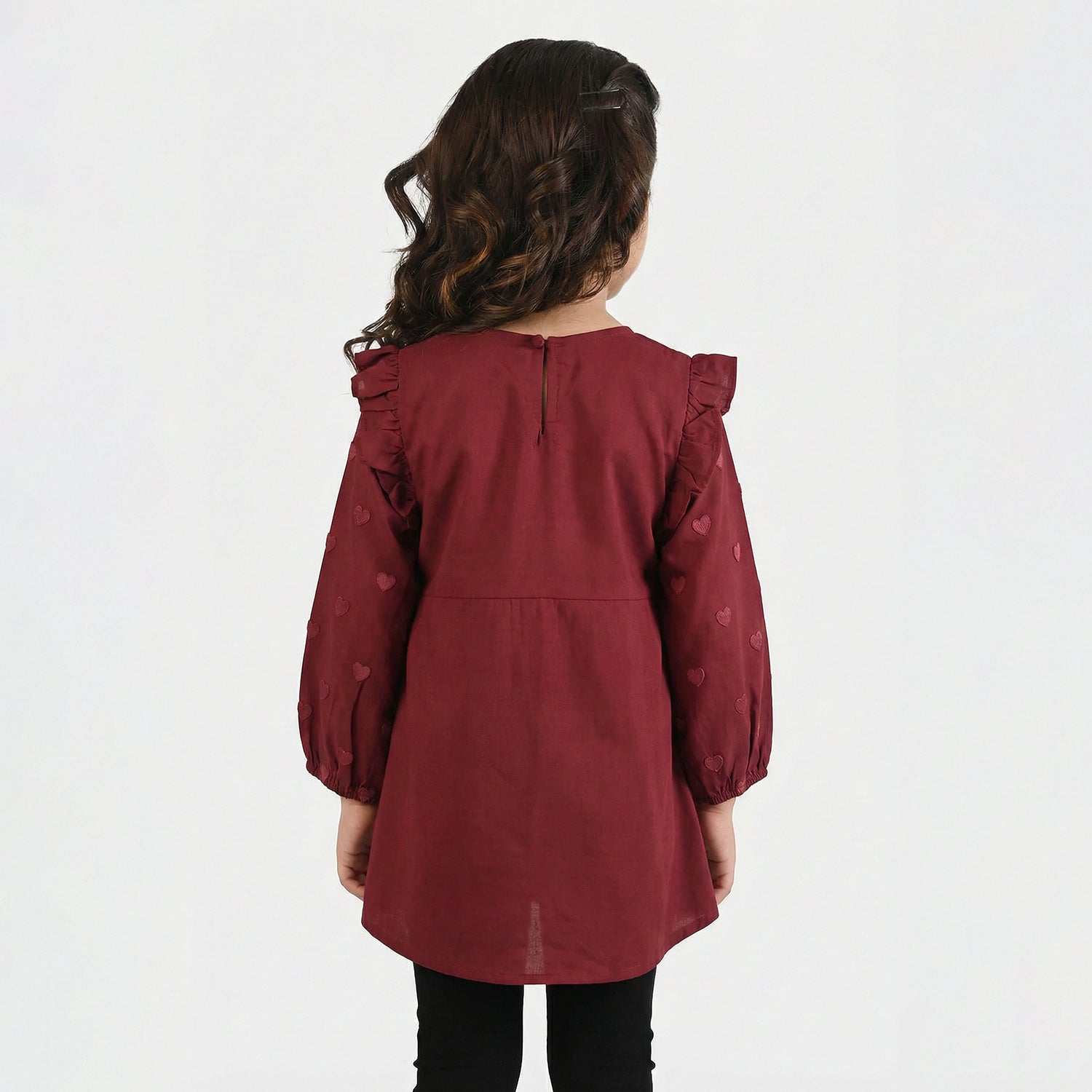 This maroon frock-style shirt features a cute heart print, round neck, full sleeves, and ruffle detailing. Perfect to pair with tights or pants for a sweet everyday look.