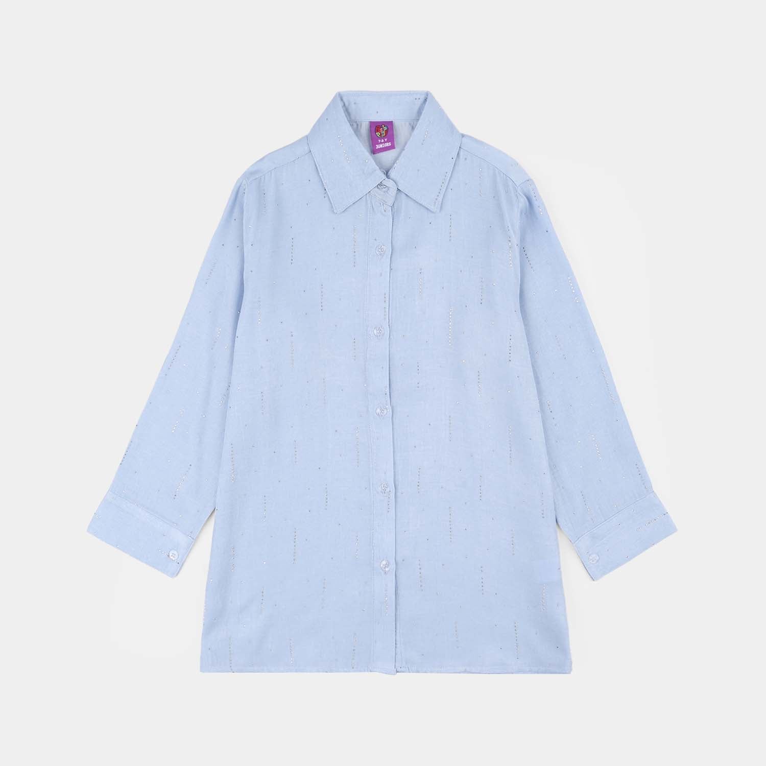 This sky blue poly crinkle casual top for girls features a button-down front, collar, and cuffed sleeves, perfect for a comfortable and stylish everyday look.