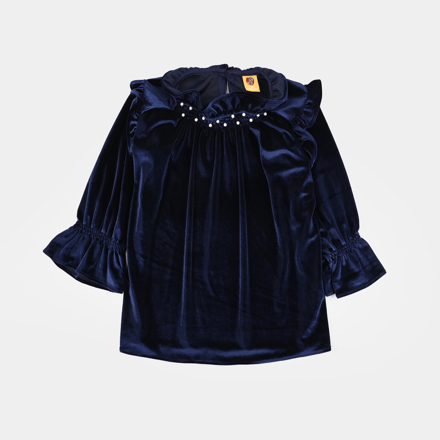 This navy blue girls' velvet top features delicate pearl accents and cute ruffled sleeves for a trendy look. Made from rich velvet, it offers warmth, softness, and stylish comfort, perfect for special occasions and cooler days.