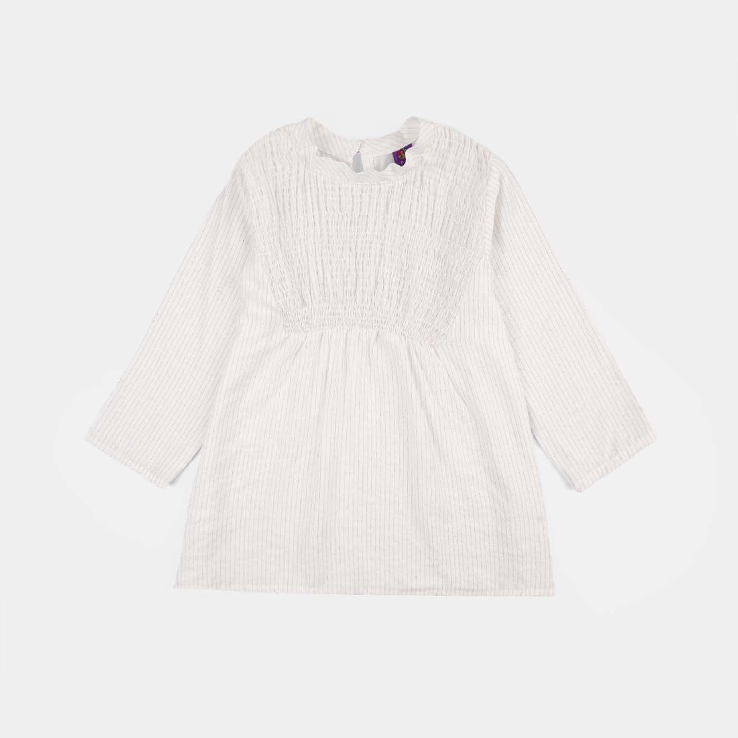This white viscose casual top for girls features a ruffled neck, full sleeves, and elastic detailing on the front, perfect for a comfortable and stylish everyday look.