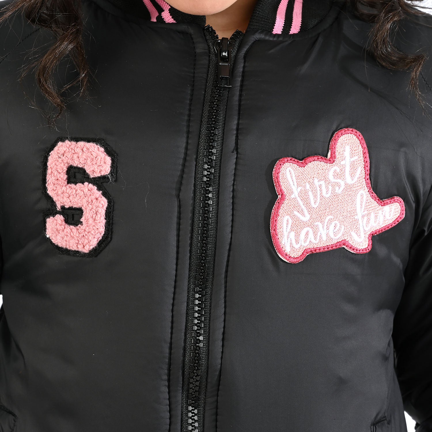 Wear this black quilted jacket this winter, featuring embroidered patches and a front zipper with a subtle touch of pink for a refined, stylish appearance.