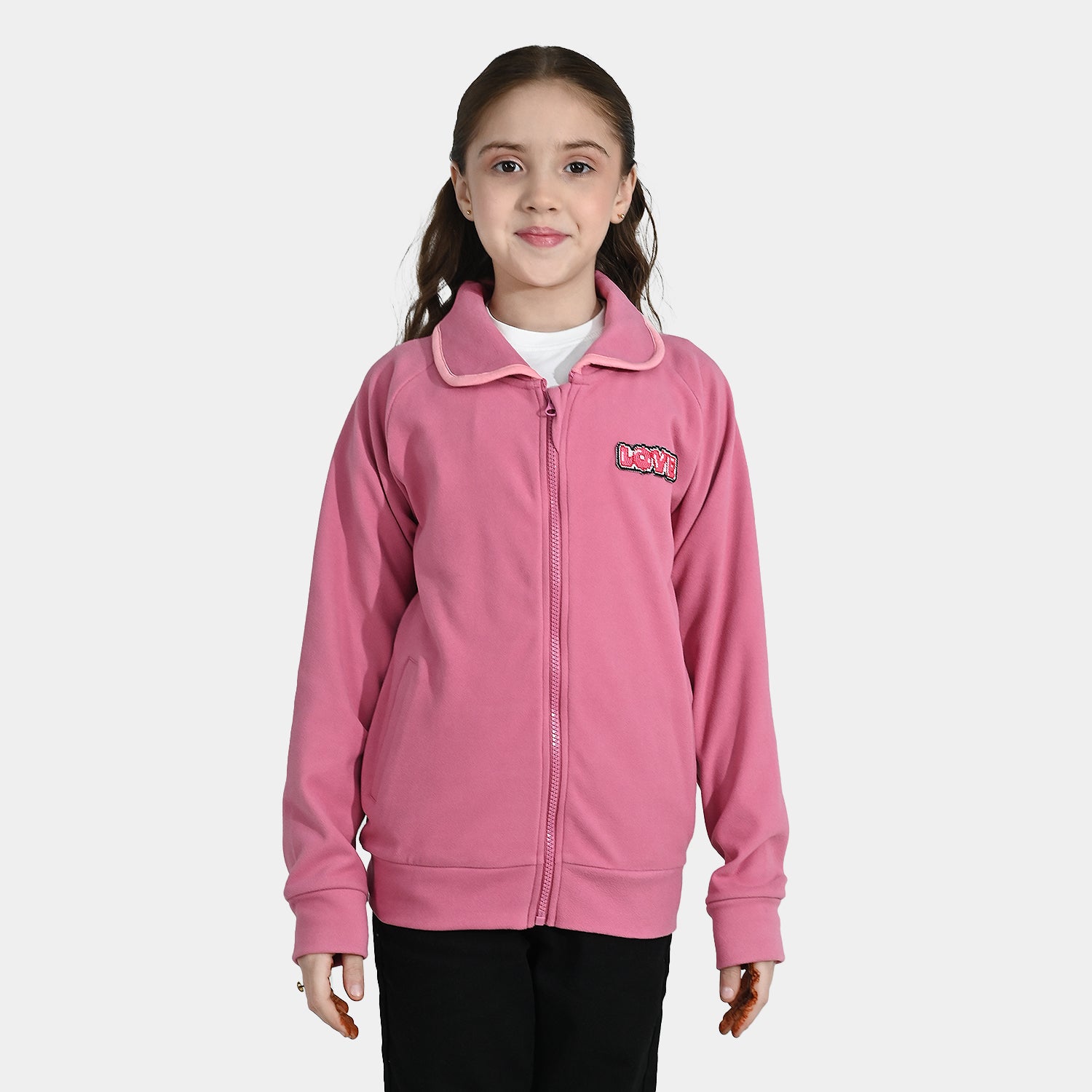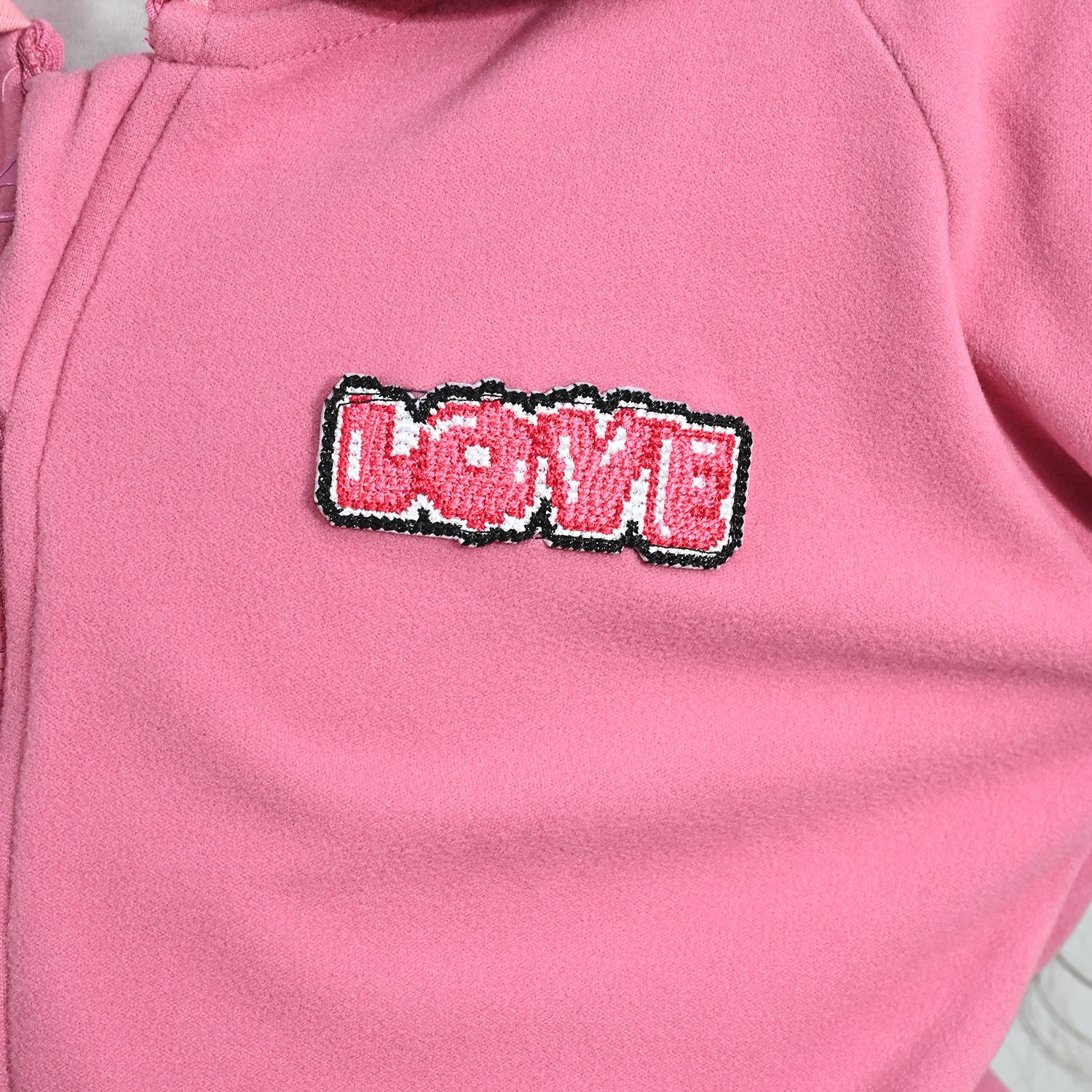 Pink zip-up velour upper/jacket featuring a collar, full sleeves, pockets, and a “Love” embellishment, perfect for easy layering.