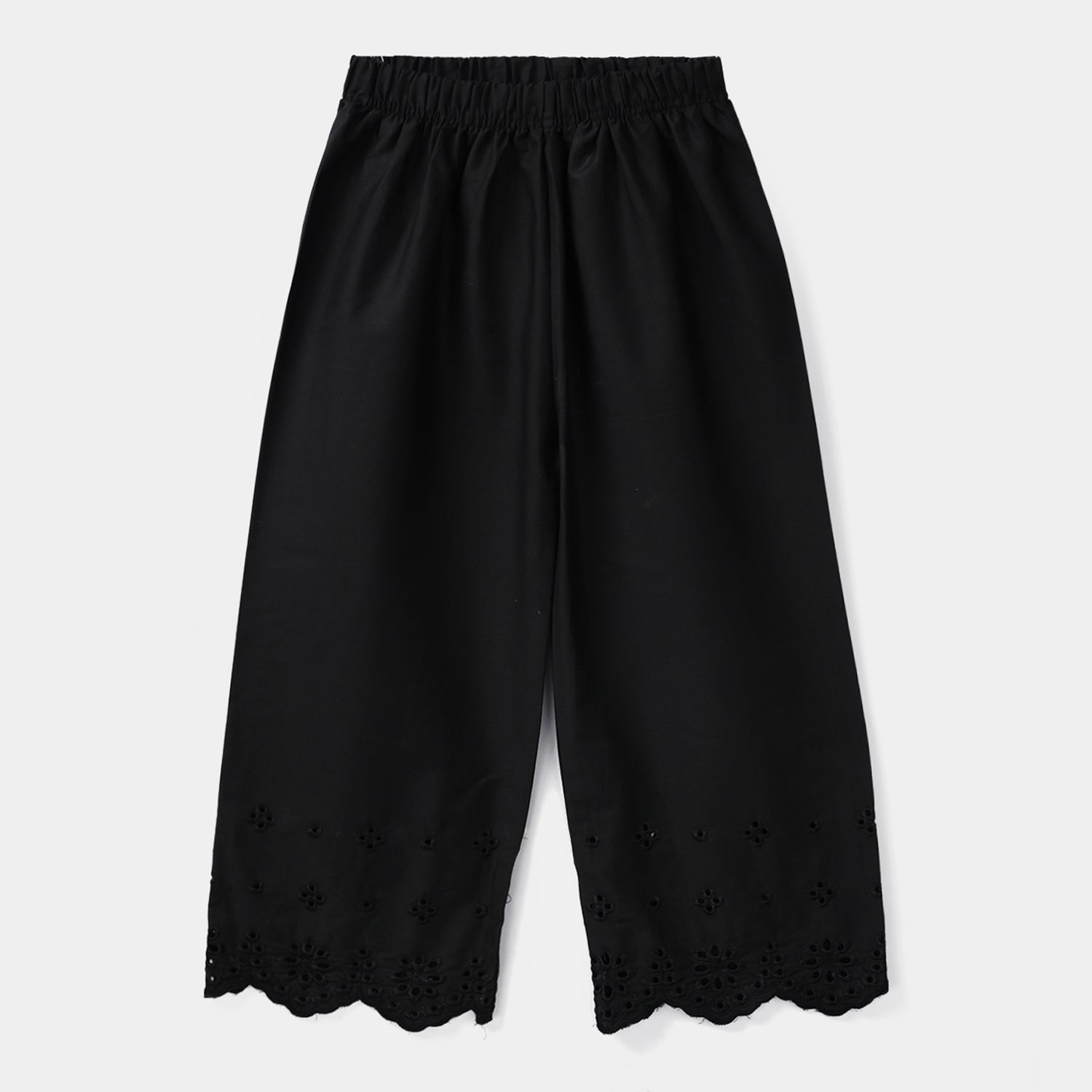 Girls black cotton embroidered pants featuring delicate floral chicken kari work, designed in a comfortable fit and perfect to pair with kurtas, shirts, or frocks for a graceful everyday or festive look.