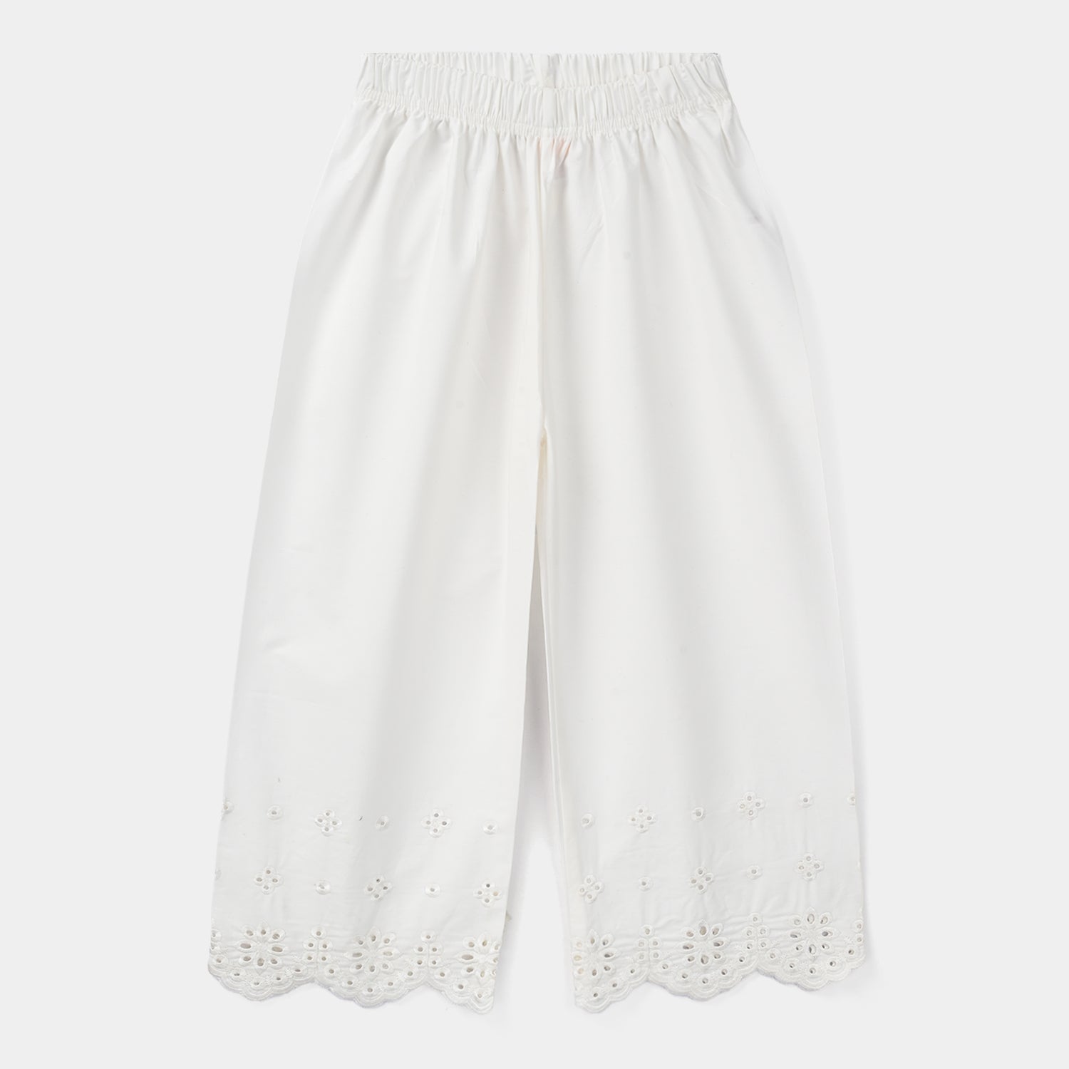 Girls white cotton embroidered pants featuring delicate floral chicken kari work, designed in a comfortable fit and perfect to pair with kurtas, shirts, or frocks for a graceful everyday or festive look.