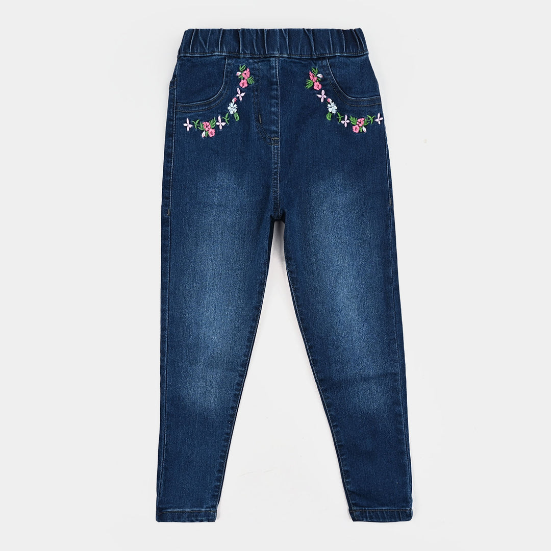 Girls Denim Stretch Jeggings Flower Emb-Mid Blue