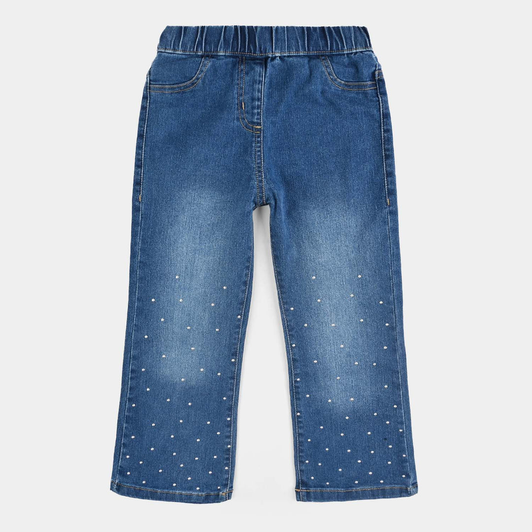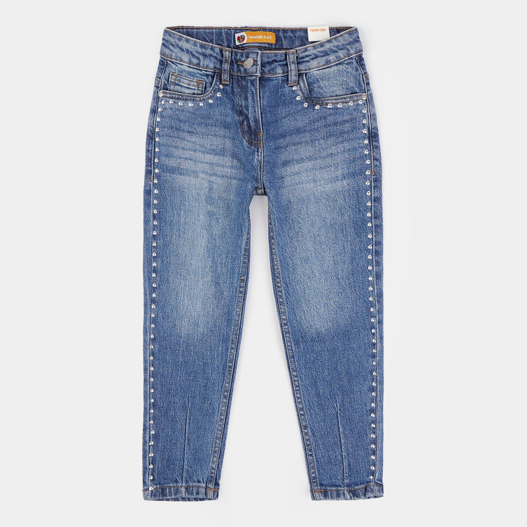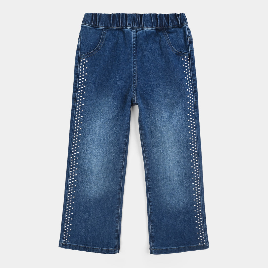 Girls Denim Stretch Pant Studs one Side-Mid Blue