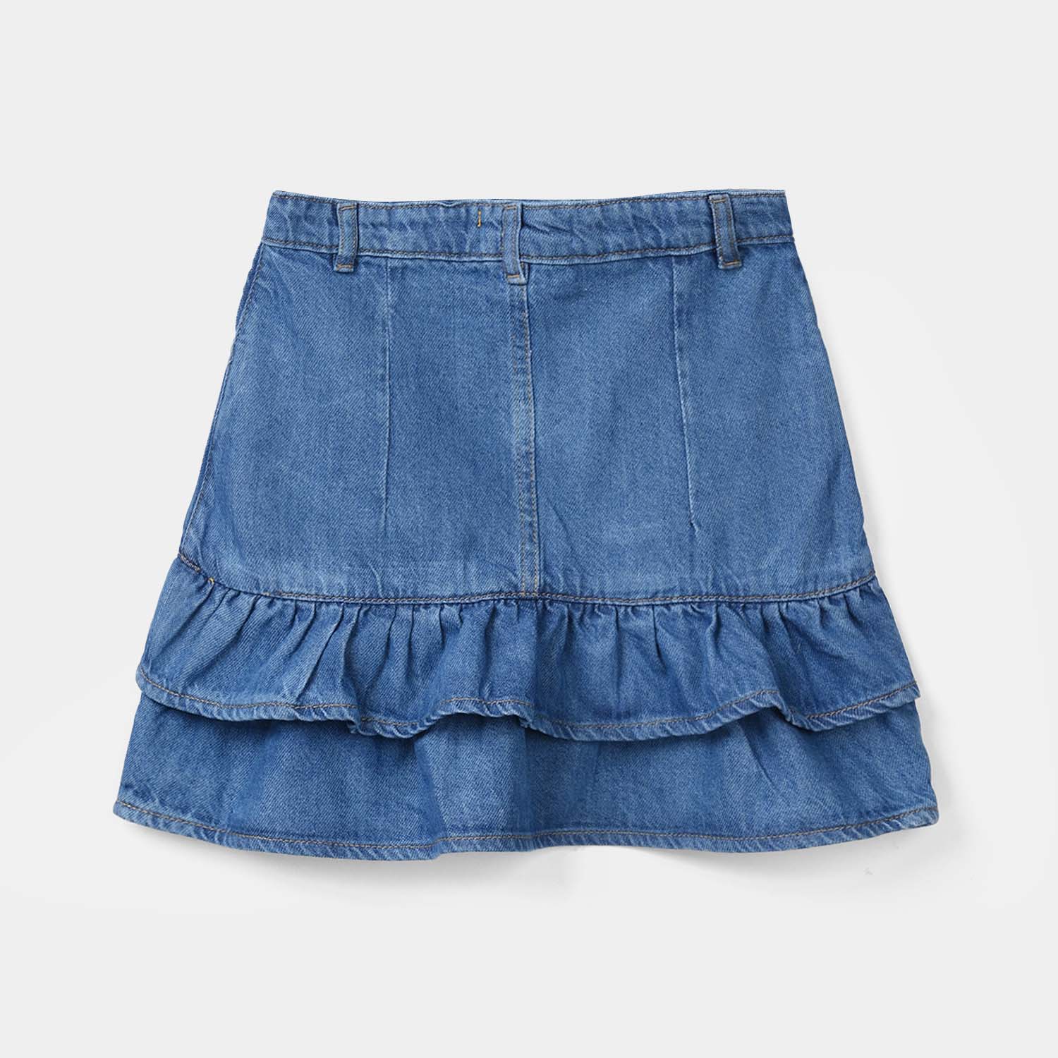 Girls’ denim rigid skirt in dark blue, featuring frill detailing, pockets, and a versatile design that can be paired with any top or shirt.